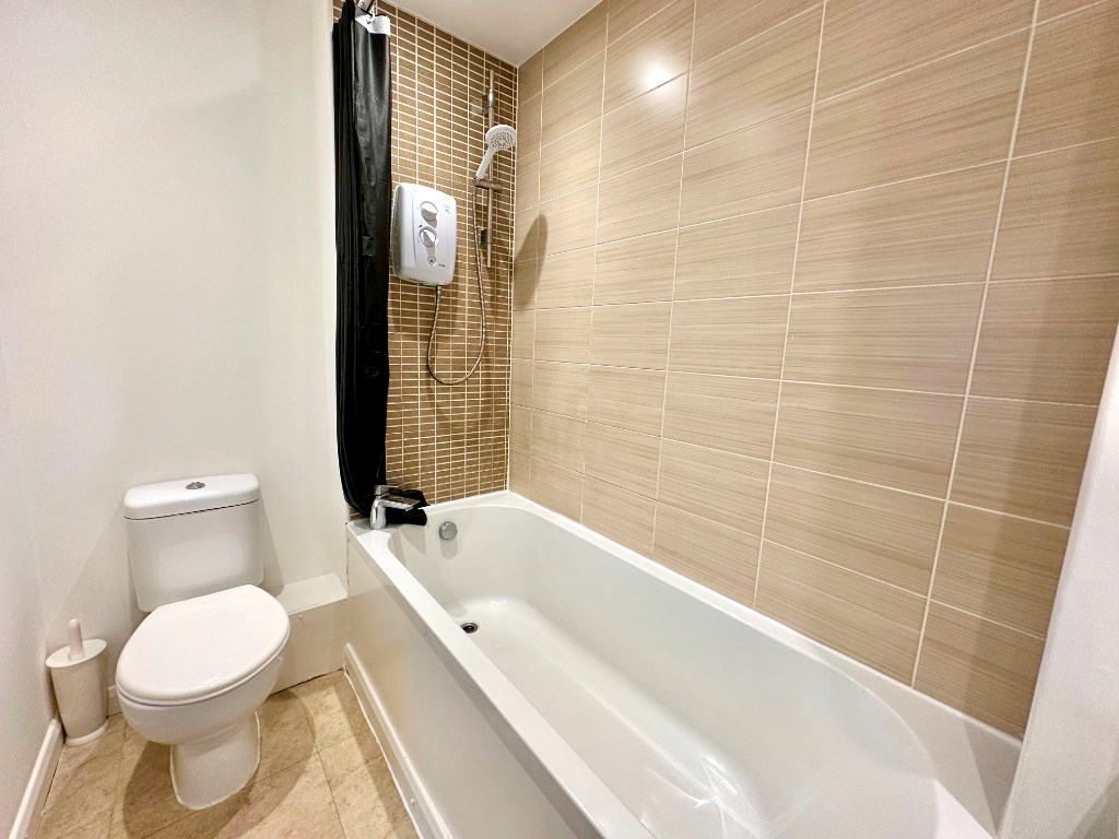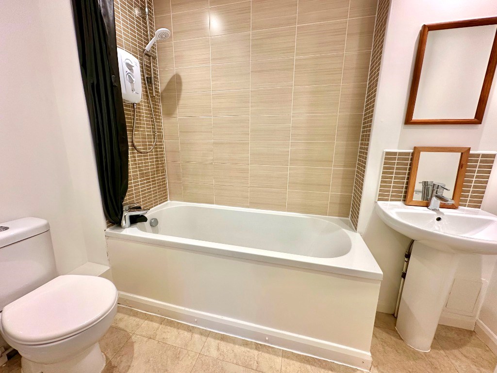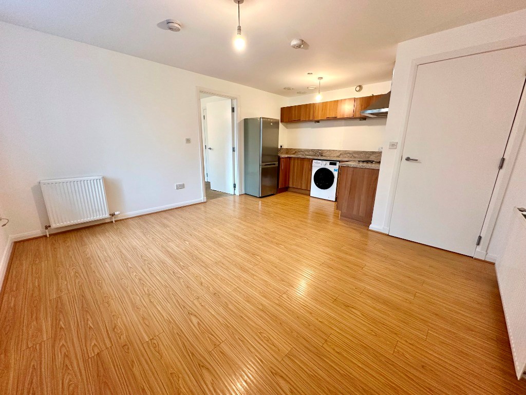 This unfurnished ground floor apartment features one double bedroom, spacious open plan living room and kitchen area with appliances including washing machine, fridge freezer and electric hob and oven. There is also a modern internal bathroom with white bathroom suite and electric shower over the bath.