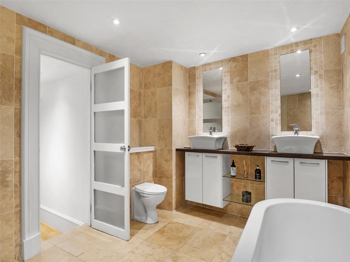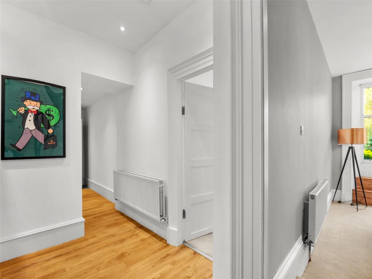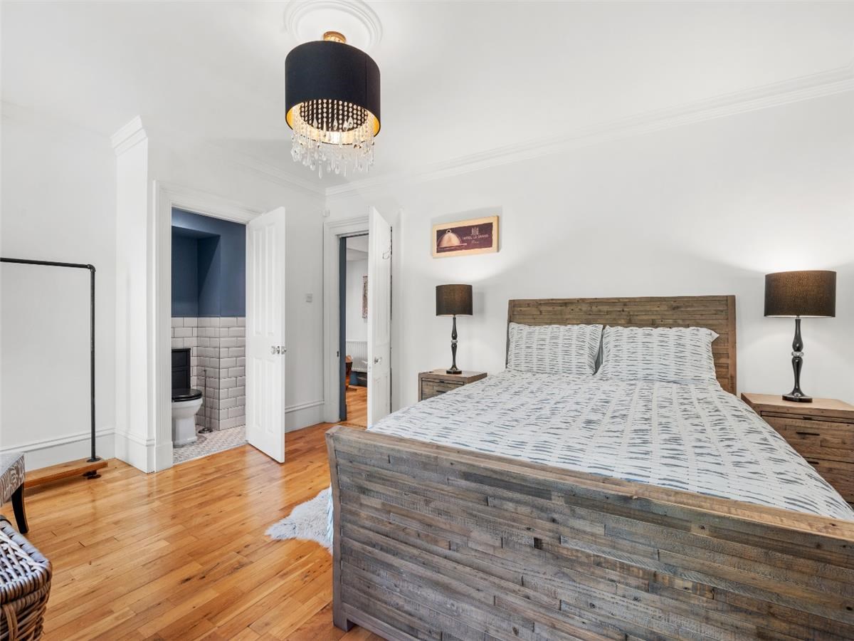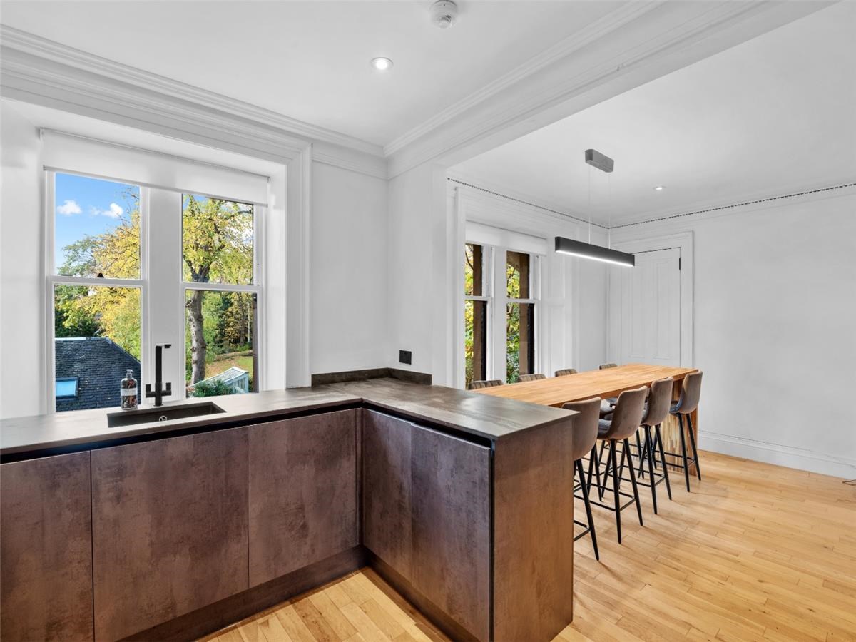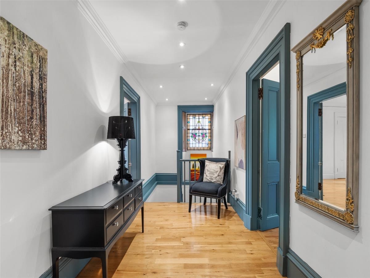 Entry to the property is via a large communal hallway which hosts a stained glass window. The apartment itself extends to some 1670 sq ft and consists of a large, bay windowed lounge with fabulous original cornicing, an upper and lower hallway with a stained glass window at the stairway, a large dining kitchen, a bedroom with en suite toilet, 2 further large bedrooms and a large bathroom with shower, bath, WC and two sinks. There is a separate area for the washing machine and tumble drier and plenty of storage. The upper floor benefits from solid oak flooring and there is gas central heating throughout. All windows are serviced by electric blinds.