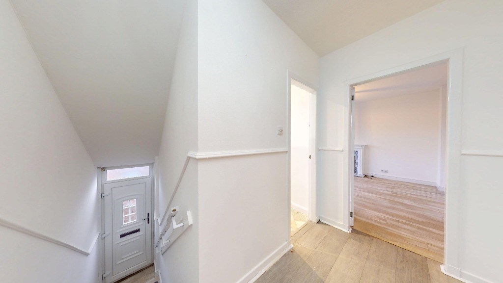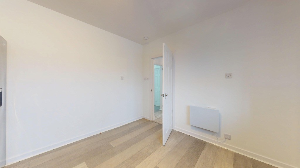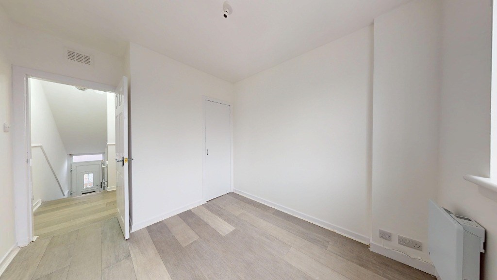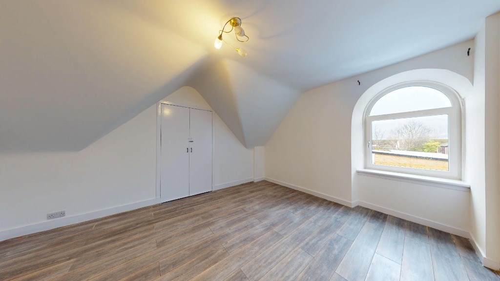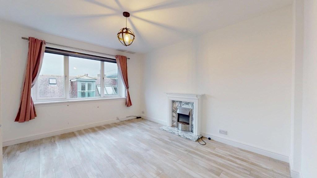 This newly renovated 3-bedroom flat in Echt, Aberdeenshire offers a harmonious blend of modern amenities and classic charm. Spanning 883 sq. ft., the property boasts a thoughtful layout with a spacious living room, three bedrooms, a kitchen, and one bathroom. The living area is a highlight, featuring a decorative fireplace, large windows allowing ample natural light, and an elegant pendant light fixture. Throughout the flat, light-toned wood flooring creates a sense of warmth and continuity.