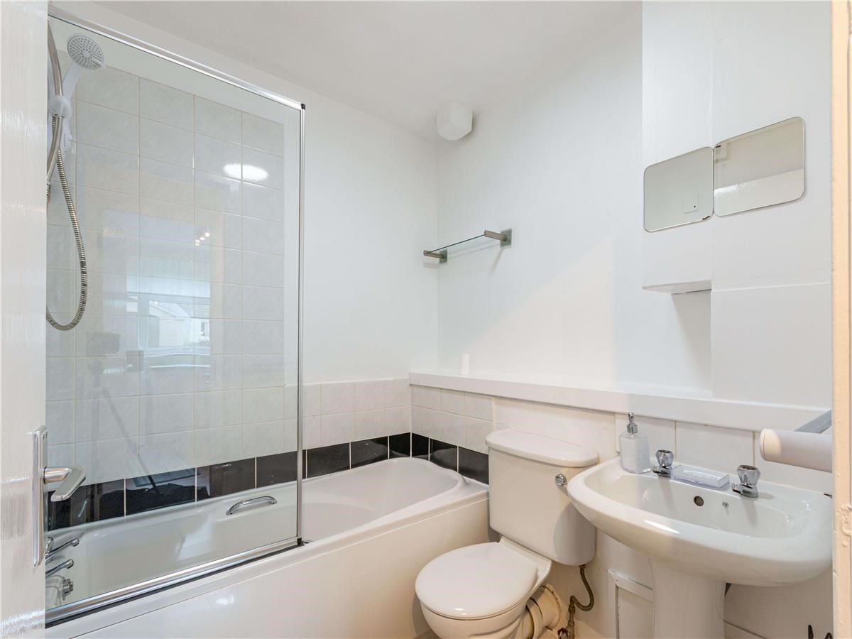 ~Beautiful bathroom suite with electric shower over bath and tiled splashback