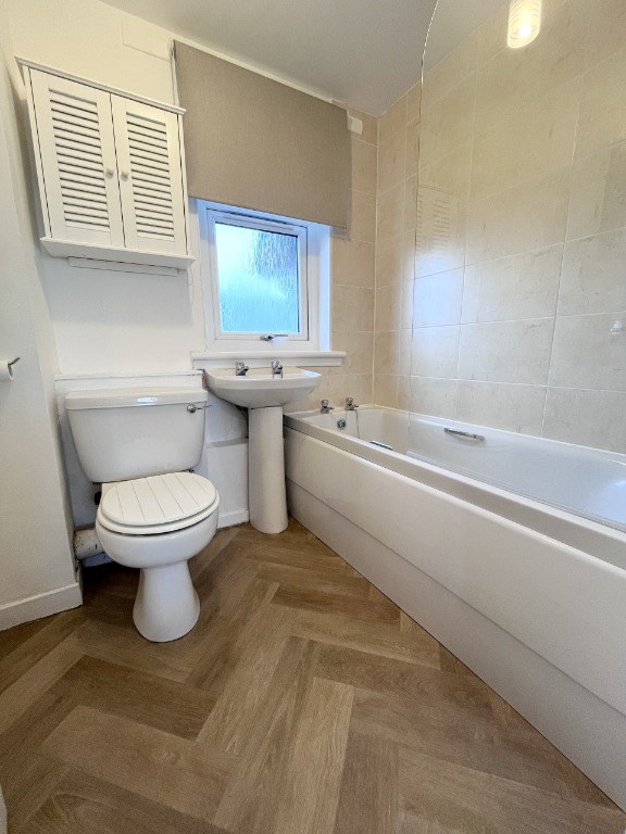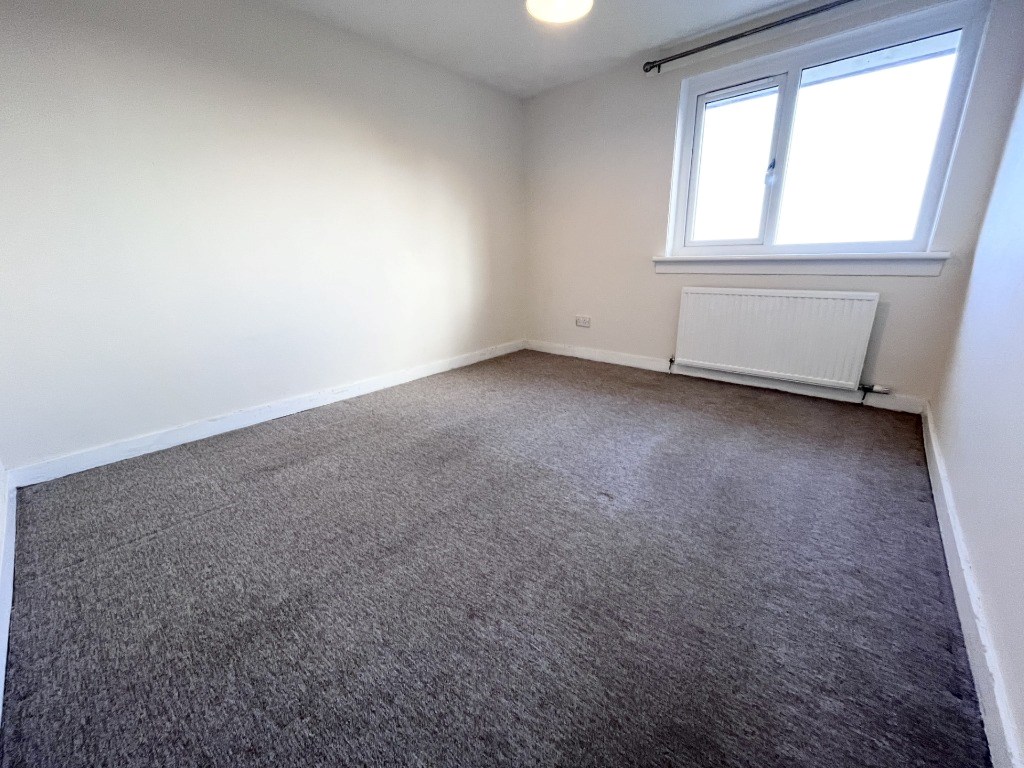 The property boasts two generous double bedrooms, both finished with neutral decor and carpet flooring, offering plenty of space for free-standing furniture. Bedroom one also benefits from a handy built-in storage cupboard. The stylish bathroom includes a white three-piece suite with overhead shower and contemporary wall tiling.