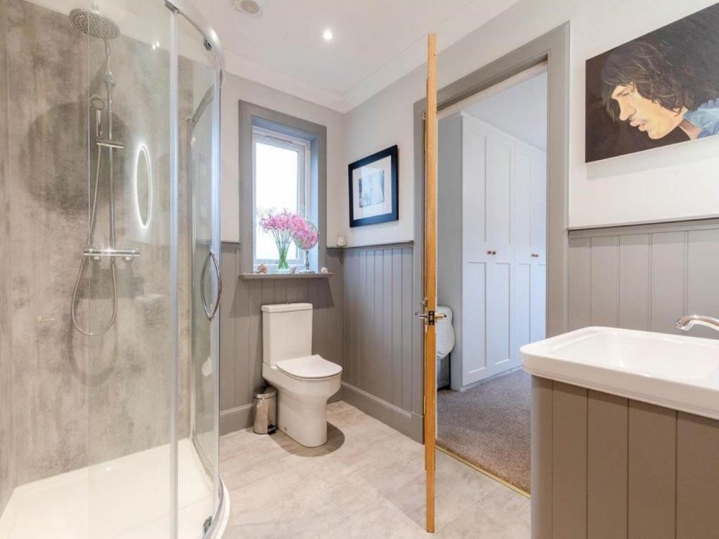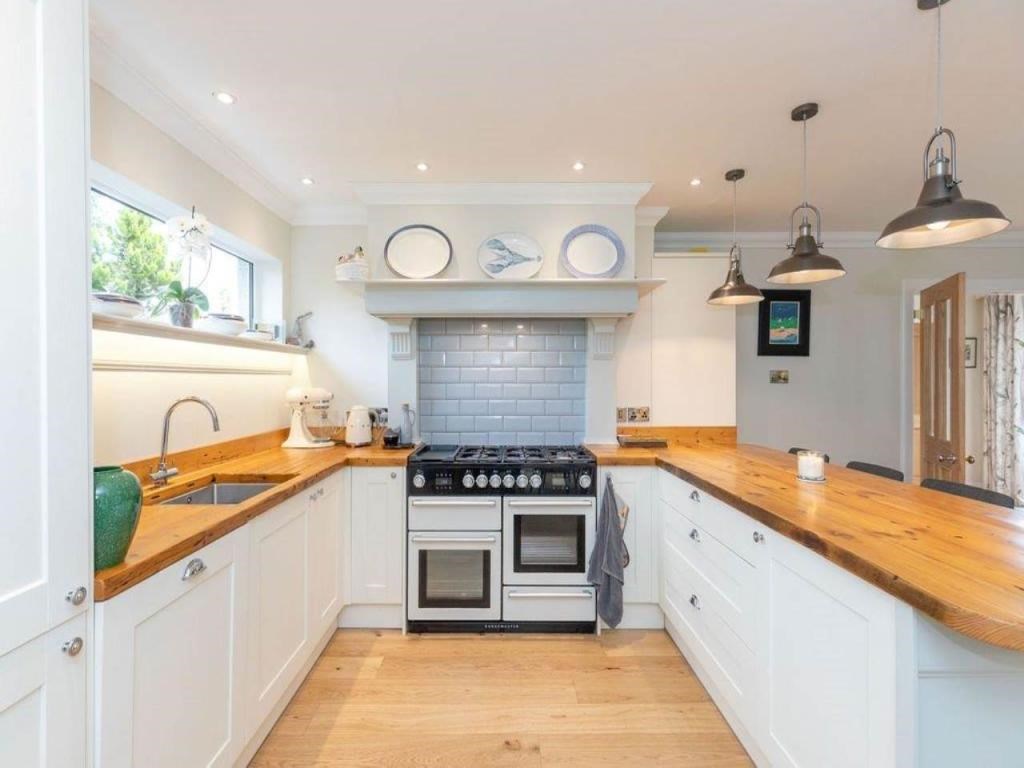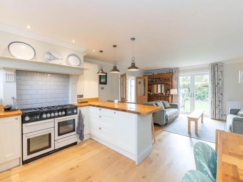 The spacious entrance hall leads through to a large, open plan kitchen/living/dining area. The kitchen is has integrated appliances and a range cooker, there is a log burner and three sets of patio doors which lead to the garden.