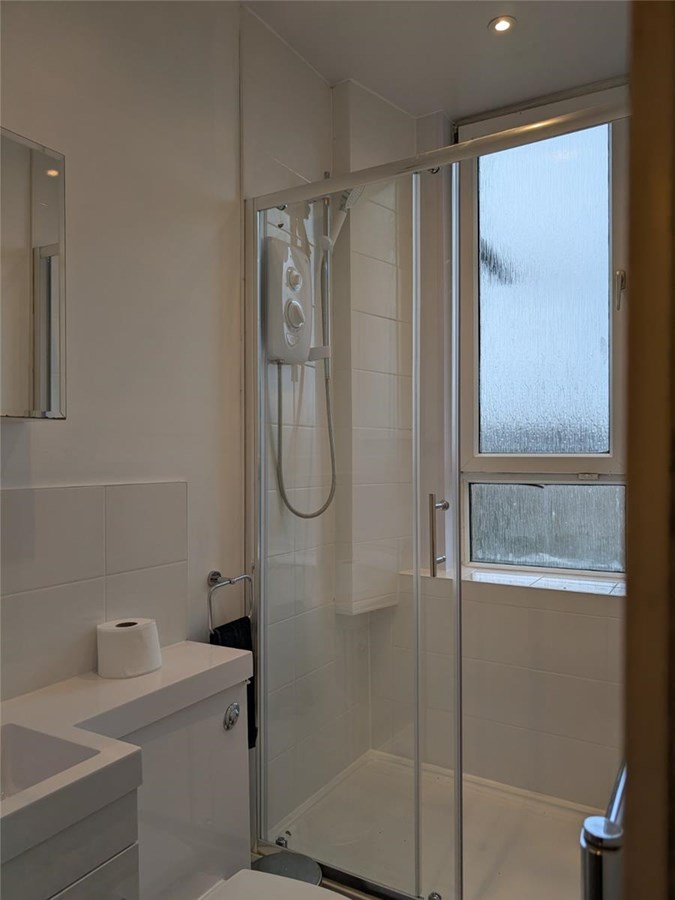 There are two generously sized double bedrooms, both with recessed windows and ample wardrobe storage, offering flexible and comfortable accommodation. Completing the property is a modern bathroom with a fully enclosed electric shower.