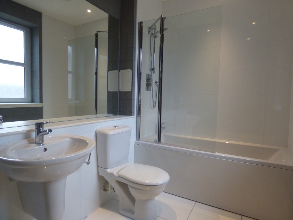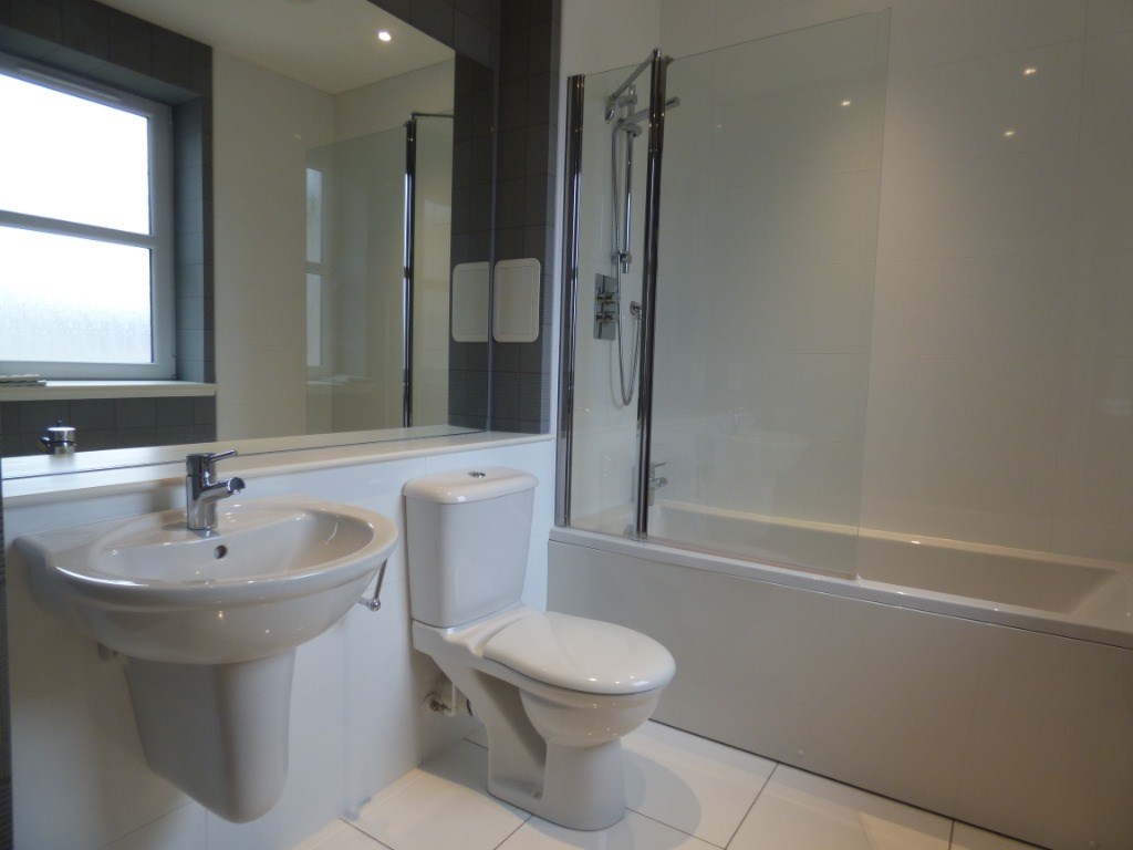 Bathroom: Fully fitted white three-piece. The bathroom has been elegantly finished with coordinating tiles around the bath and sink area.