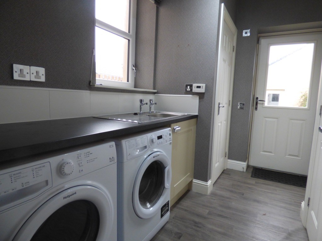 Utility Room. Fitted with modern white units, incorporating worktops, washing machine and tumble drier.
