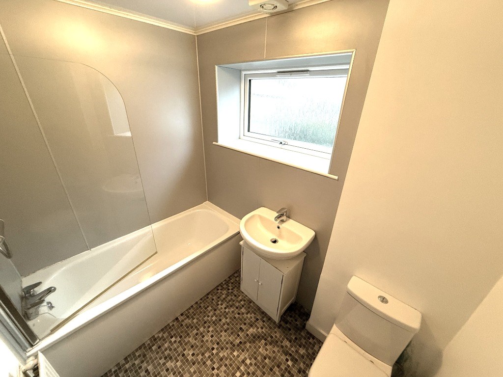 Fitted with white suite comprising w.c., wash hand basin and bath with shower above. Central heating radiator and vinyl flooring.