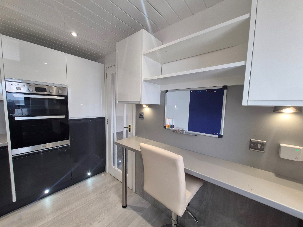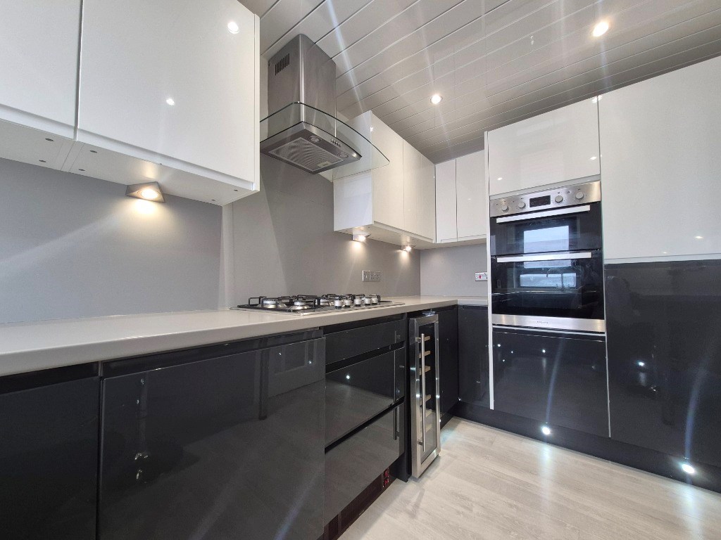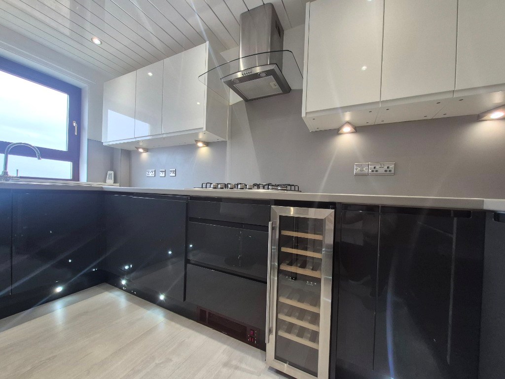 Modern fitted kitchen with intergrated appliances such as a dishwasher, fridge freezer, washing machine, hob, grill and oven. There is also a breakfast bar with stools.