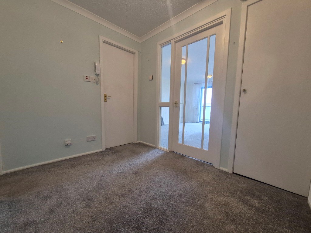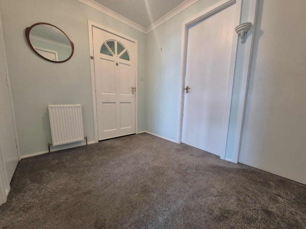 A modern entrance hall with a fitted carpet and storage cupboard.