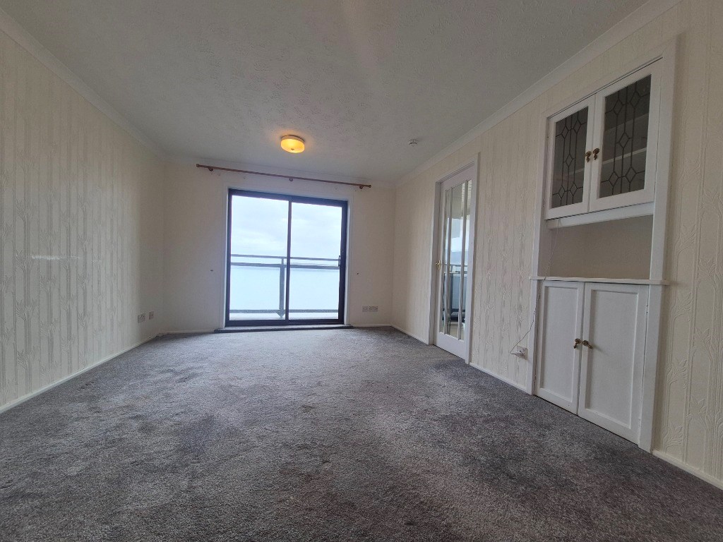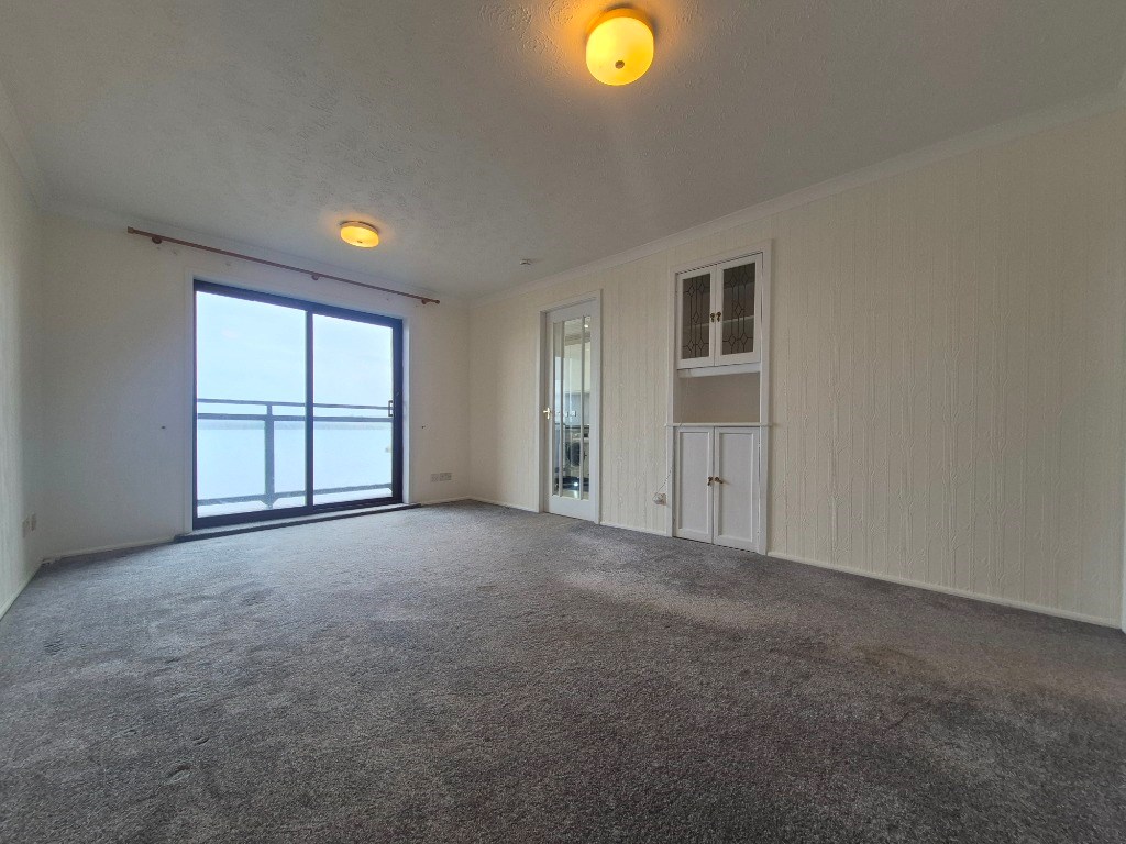 A bright, spacious and modern lounge with fitted carpet with patio doors leading onto a balcony with open sea views.