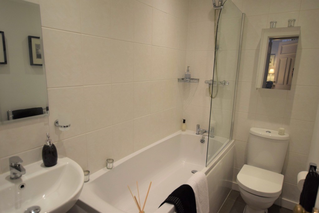 A well-proportioned bathroom featuring a white three-piece suite comprising W.C., wash hand sink with pedestal and bath with mains shower over. Shower screen. Extractor fan. Modern ladder style radiator.