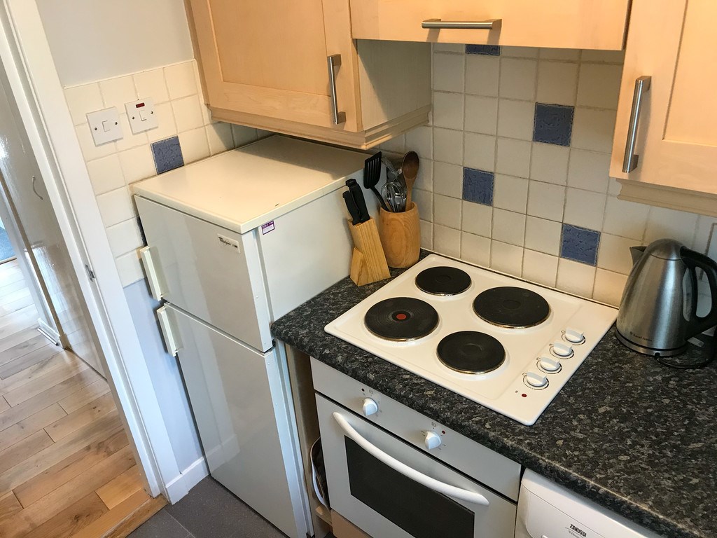 KITCHEN Compact modern kitchen with a range of appliances including an electric hob and oven.