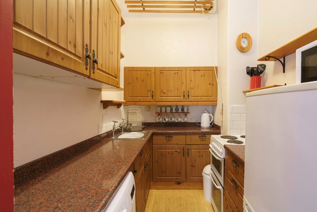 KITCHEN Fully equipped kitchen a range of free-standing appliances including a fridge/freezer, washing machine and a free-standing electric oven and hob. Wooden wall and base units provide a great amount of storage and benefits from a ceiling airer extender.