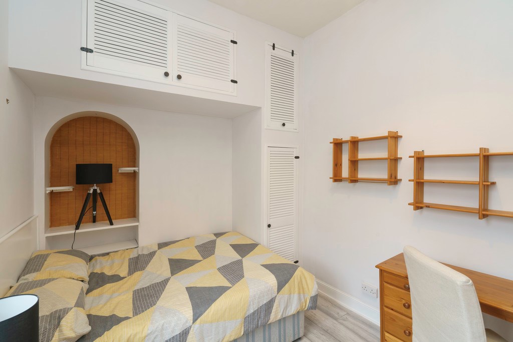 BEDROOM Large double bedroom located to the rear of the building which benefits from a large window providing plenty of natural light. The bedroom is furnished with a double bed, integrated storage units, free standing wardrobe, bedside table, and a free-standing desk. The bedroom is completed with laminated flooring and neutral wall tones.