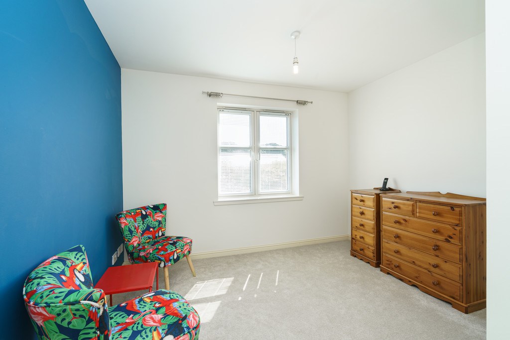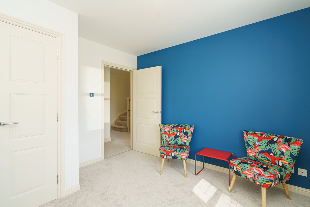 FIRST FLOOR BEDROOM 1 A fantastic double size bedroom which has been decorated in neutral tones with a blue featured wall and grey carpeted flooring. Large integrated wardrobes provide a great amount of storage.