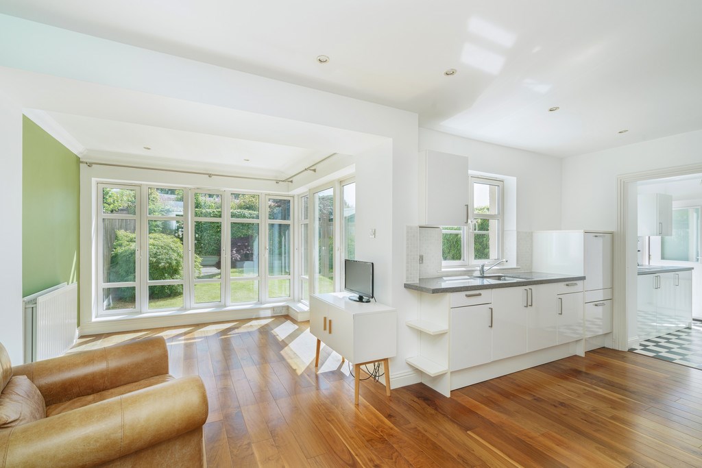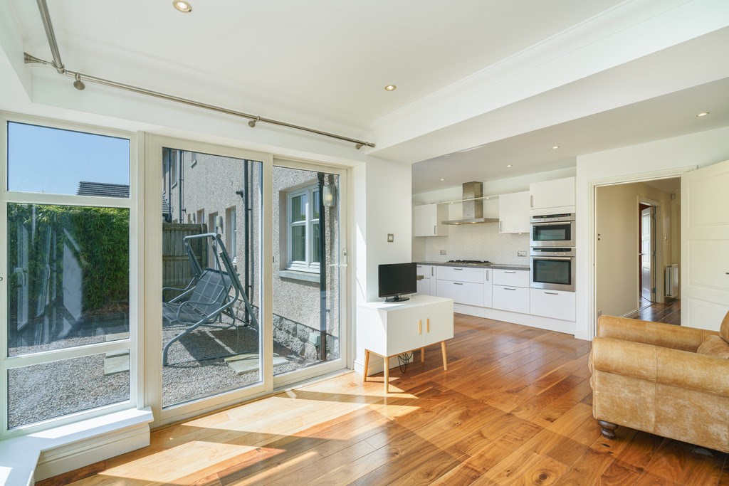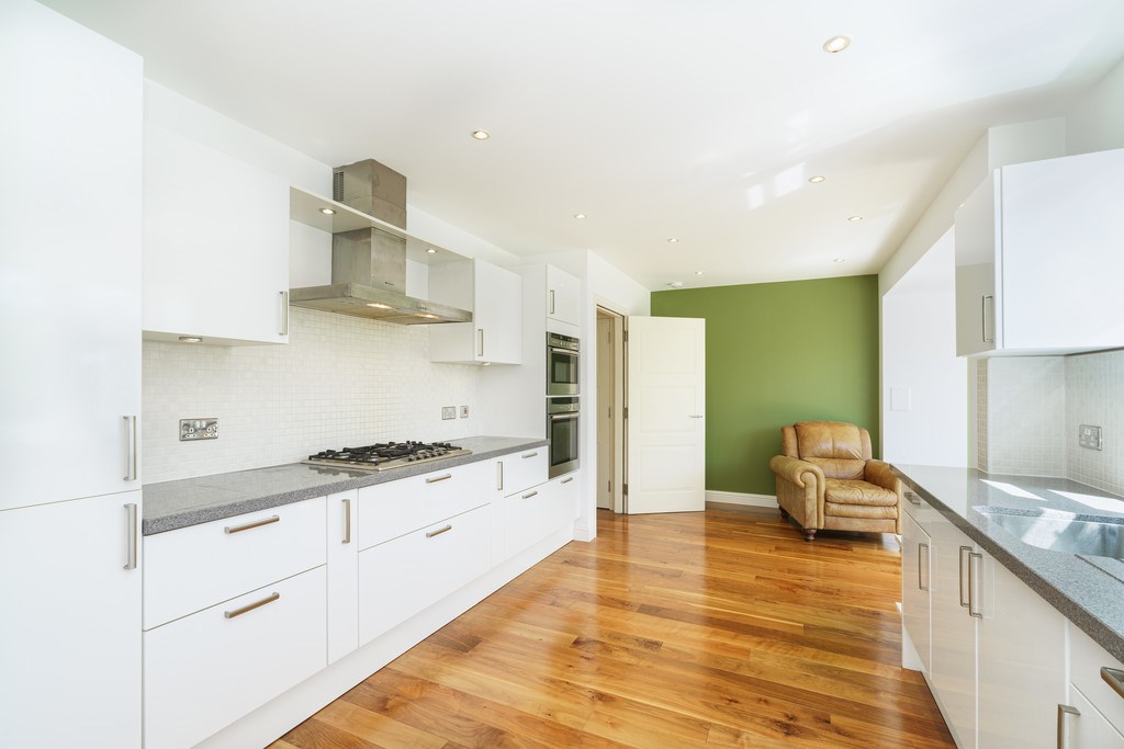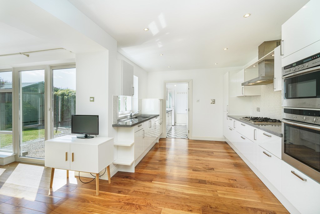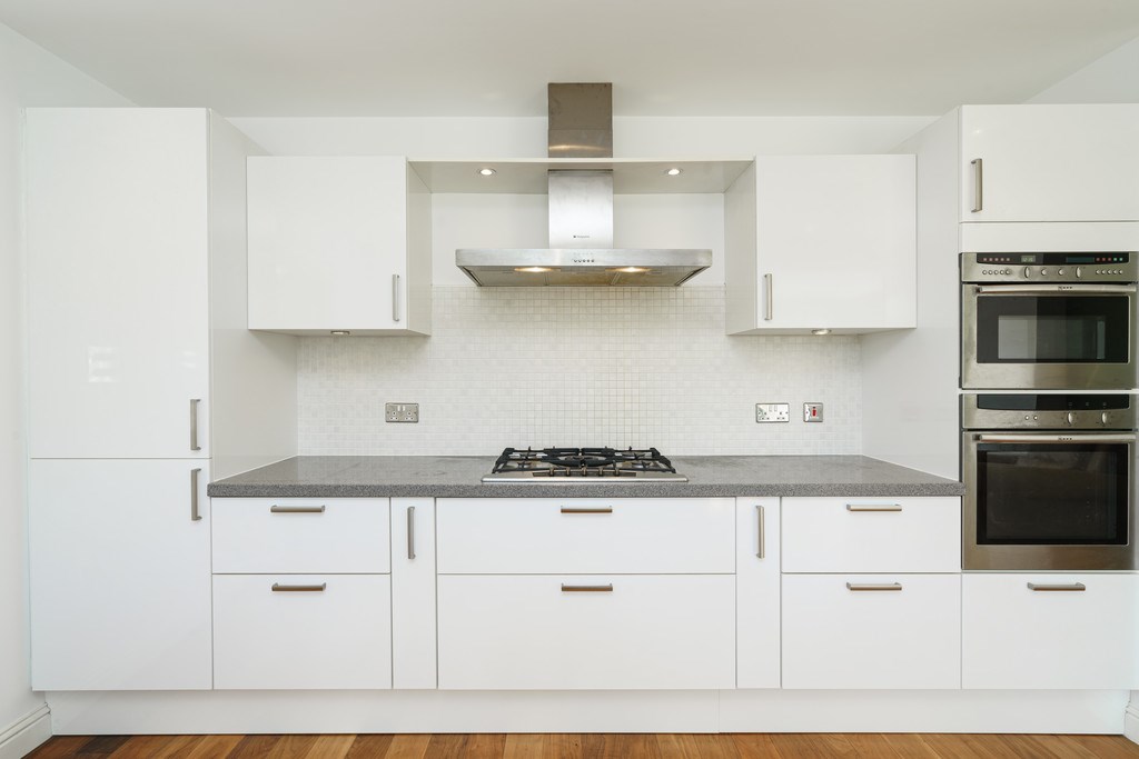 KITCHEN/DINER/ LIVING Modern sleek fully fitted kitchen with high quality integrated appliances. The stylish white gloss units are complimented by the grey counter tops. The kitchen includes a five-gas burner hob with extraction fan, large oven and separate grill and an integrated fridge/freezer making this ideal for the enthusiastic cook. Leading off the kitchen there is a beautiful open plan dining/living which has been decorated in neutral tones and hard wood flooring. Large double patio doors lead on to the full enclosed garden.