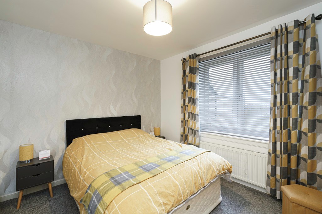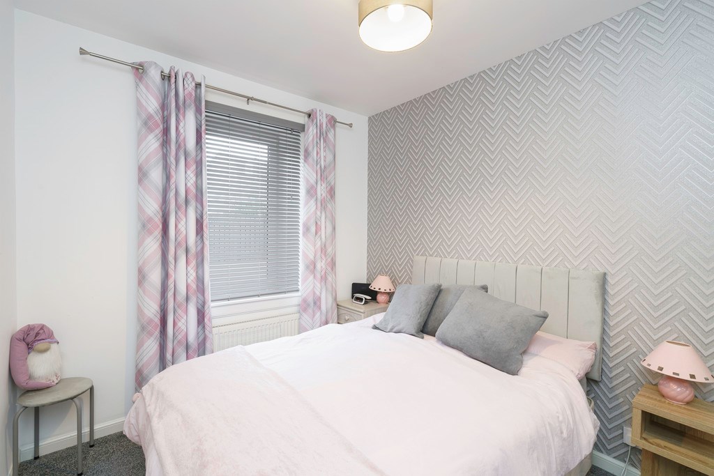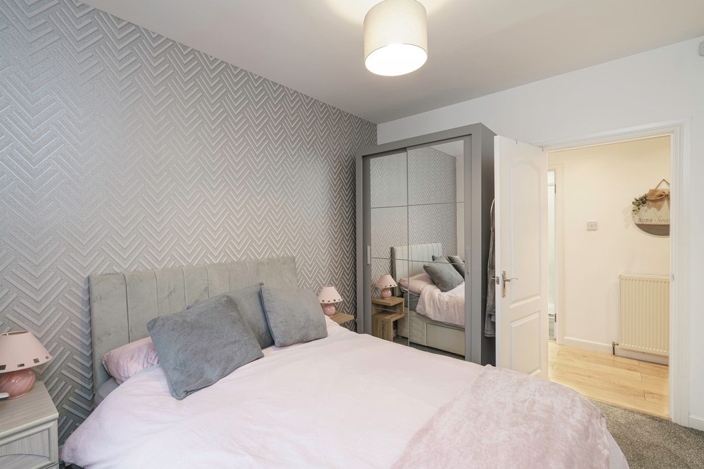BEDROOM 2 A further great sized double bedroom again benefitting from double mirrored wardrobes and plenty of space for free standing furniture. Featuring a beautiful silver patterned feature wall, neutral walls, and plush grey carpeted flooring.