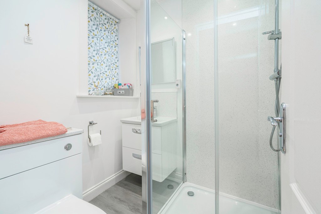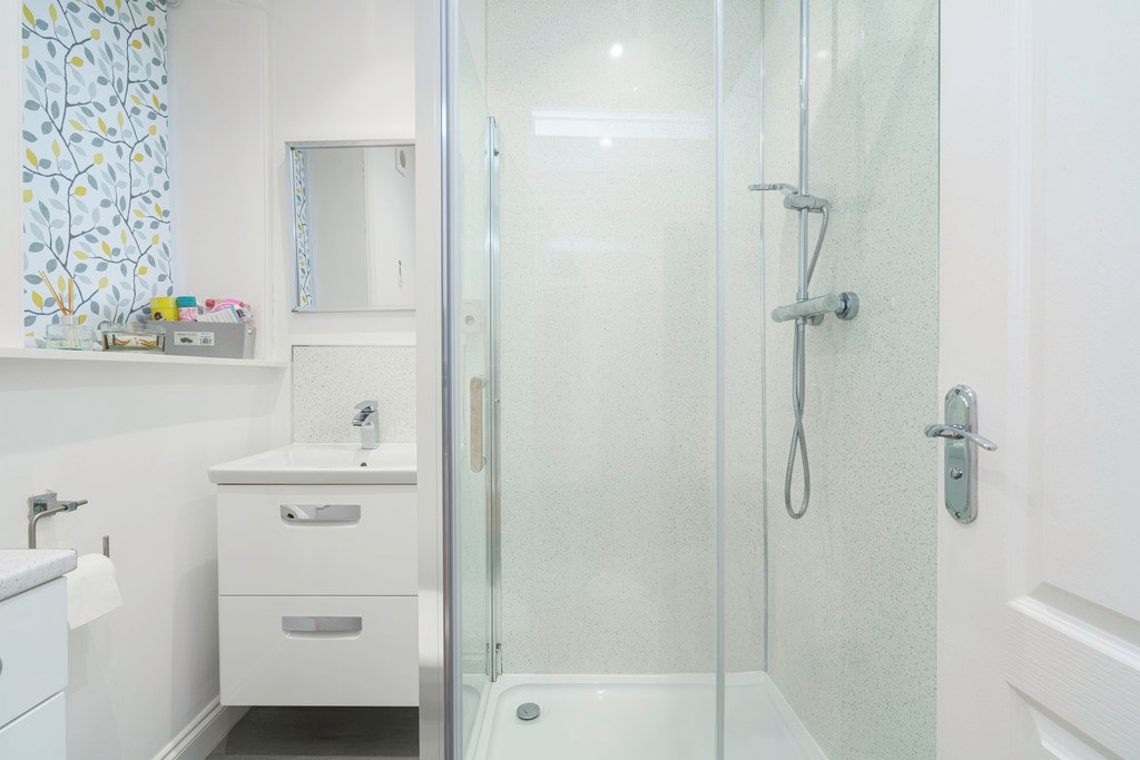BATHROOM Beautiful designed modern bathroom with a three-piece white suite with shower cabin. The bathroom has been beautifully decorated with glitter white aqua panelled surrounds and grey laminated flooring. Large window provides great amount of natural light.