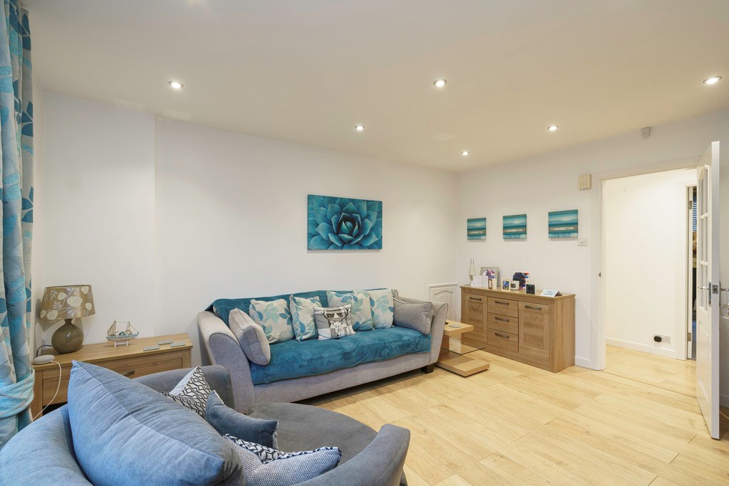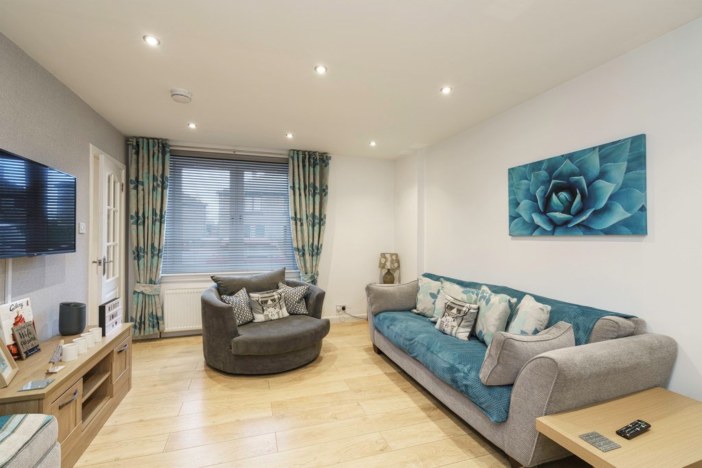 LOUNGE Beautifully decorated living area with a large fabric grey three-seater sofa, large single cuddle chair, solid wooden coffee table, console unit, side tables and much more. The living room benefits from modern décor such as hard wood flooring, grey patterned feature wall and neutral décor. The living area benefits from a dining table which can accommodate up to four people making this space ideal for entertaining. Large window provides plenty of natural light.