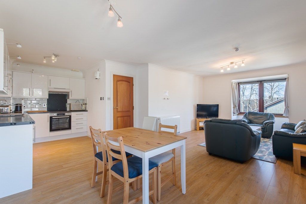 KITCHEN The kitchen for this property is attached nicely in an open plan design with the living room and begins with a dinner table surrounded by four chairs. As you enter the kitchen you will see the convenient layout here, featuring an oven cooker, fridge freezer, sink are and enough cupboard space to store all of your favourite kitchen crockery.