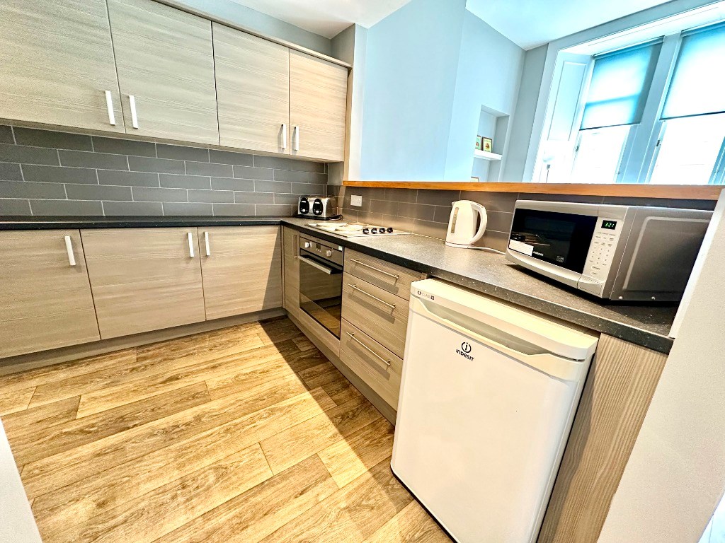 The accommodation comprises; entrance hallway with two storage cupboards off, three double bedrooms, modern fitted internal shower room with walk in shower enclosure, WC and wash hand basin and open plan living kitchen. The living area is flooded with light from three large windows to the front of the building over looking Argyle Street.