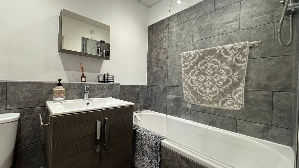 The property layout extends to entrance hallway with storage cupboard, double bedroom with fitted wardrobe, bathroom with over bath shower, good sized lounge with space for dining and a fully fitted galley style kitchen.