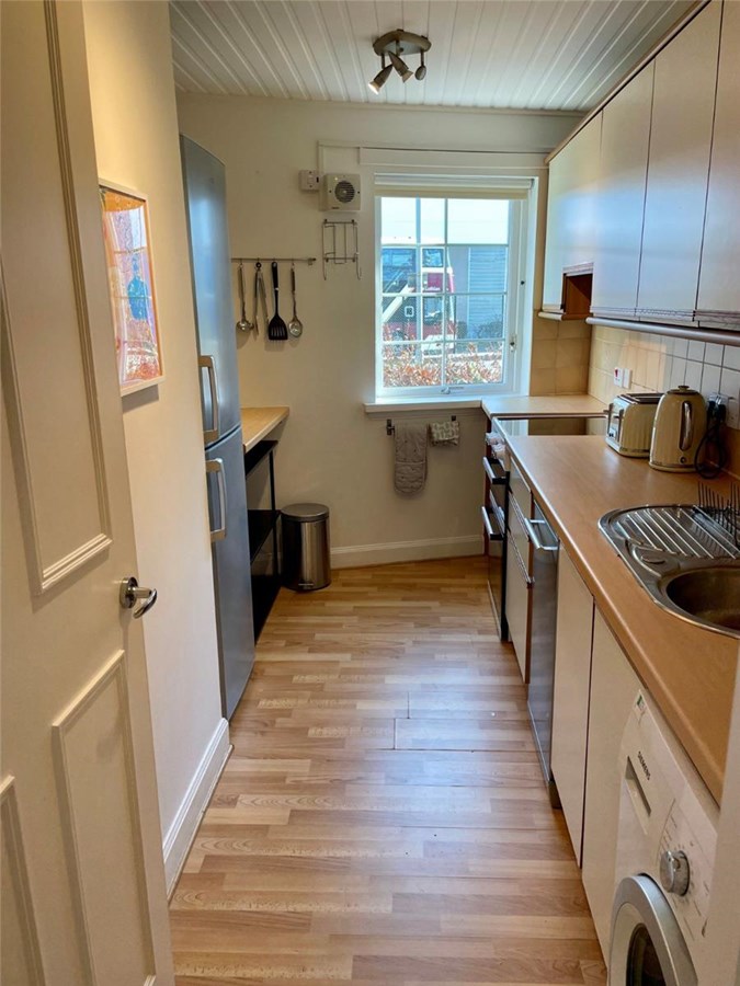The accommodation comprises a welcoming entrance hallway with a generous walk-in storage cupboard, a bright and spacious open-plan living and dining room, and a modern, fully fitted kitchen featuring quality appliances including a tall fridge freezer, washing machine, and dishwasher.
