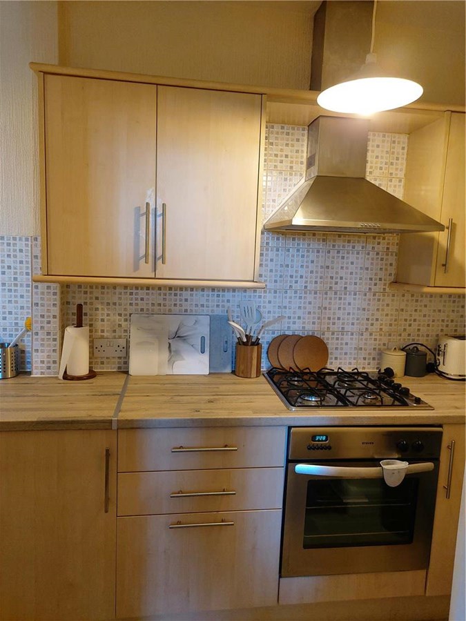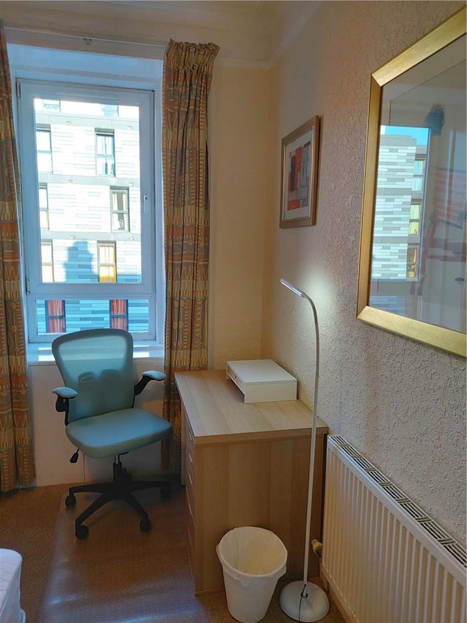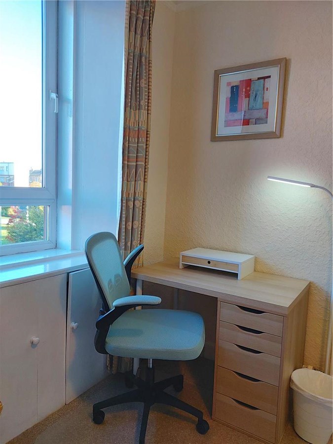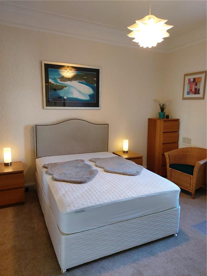 Freshly decorated and deep carpeted with new double bed, thermostatic shower over bath, and desk with office chair suited to working from home. Fully furnished and equipped to a high standard with a very comfortable, bright, homely atmosphere.