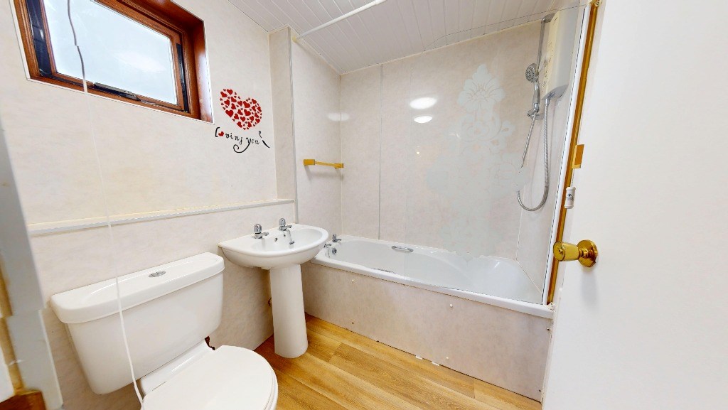 The bathroom is modern and functional, fitted with a full-sized bathtub, shower, toilet, and pedestal sink. Wood-effect flooring adds warmth, while white tiles maintain a clean aesthetic. A decorative wall decal adds a personal touch.