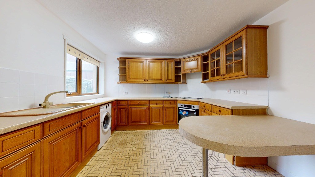 The kitchen is a standout feature, boasting honey-toned wooden cabinetry with both closed and glass-fronted units. A practical L-shaped layout incorporates ample counter space, including a breakfast bar. The room is brightened by a window and features a herringbone-patterned tile floor, adding character to the space. Modern appliances, including a washing machine, are seamlessly integrated.