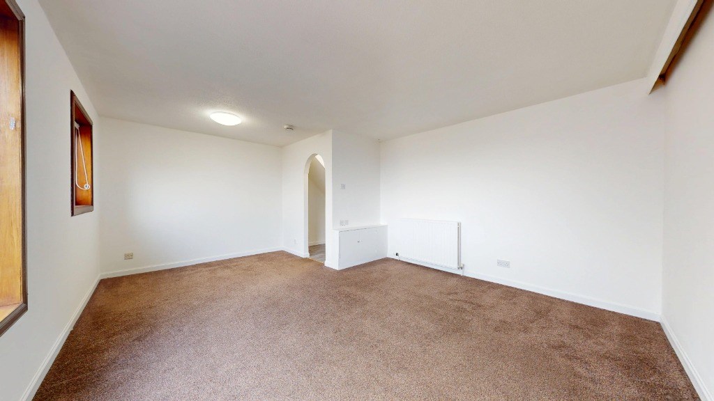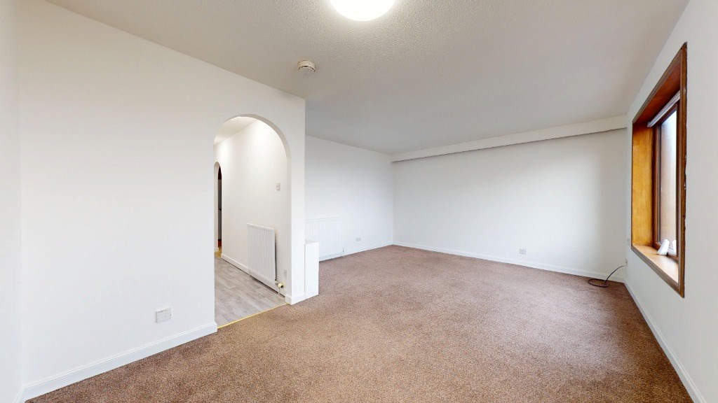 The living room is spacious and well-lit, with neutral-toned carpeting and white walls creating a blank canvas for personalisation. An arched entryway adds architectural interest, while a radiator ensures comfort year-round.