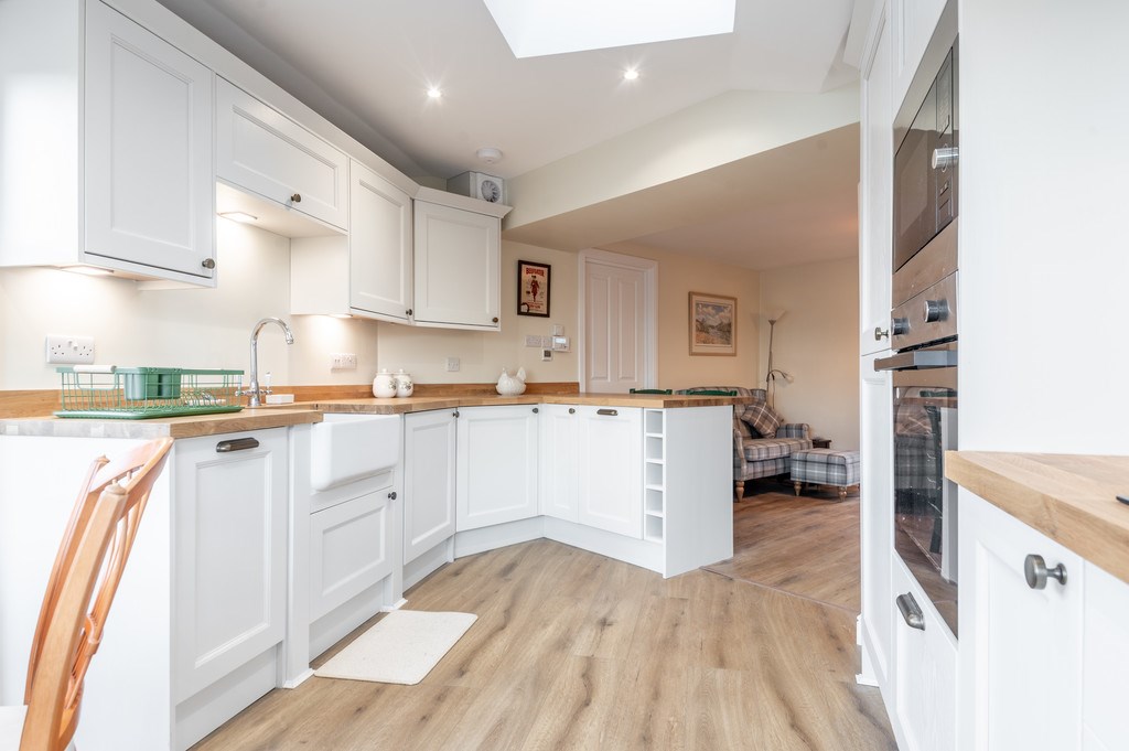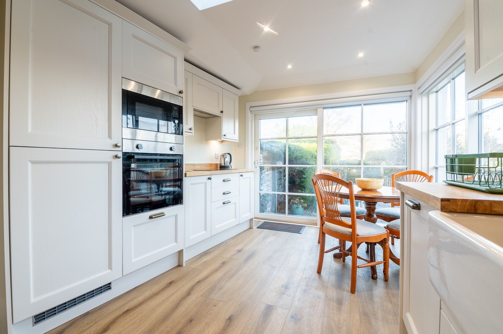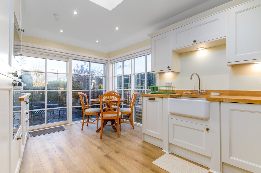 At the rear of the house is a well-equipped kitchen, featuring modern wood countertops that perfectly complement the open layout. The kitchen is flooded with natural light, creating an inviting and warm atmosphere. It also includes a dedicated dining space and a breakfast area, making it a hub for socialising, entertaining and family mealtimes.