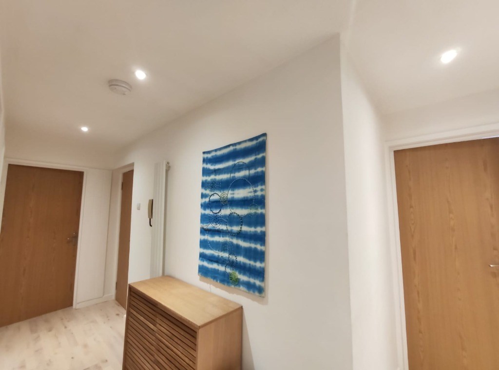 Reception hallway: The reception hallway is L-shaped and offers doors to the principal apartments. It has ceiling downlighters and access to two storage cupboards. One shallow storage cupboard with built-in shelving, one walk-in storage cupboard, which houses the washing machine, fridge, water tanks, and has built-in shelving and ceiling light.