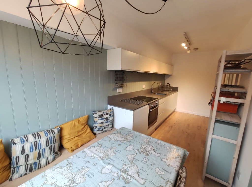 Kitchen: Containing wall and floor units with worktop surfaces, this fitted breakfasting-size kitchen has a single ball with mixer tap and side drainer. It has ceiling light, features ceiling down lights, and a light point over the breakfasting area. It has wood panelling to two walls, laminate flooring, built-in oven with ceramic hob, and wall-mounted hot water electric radiator.