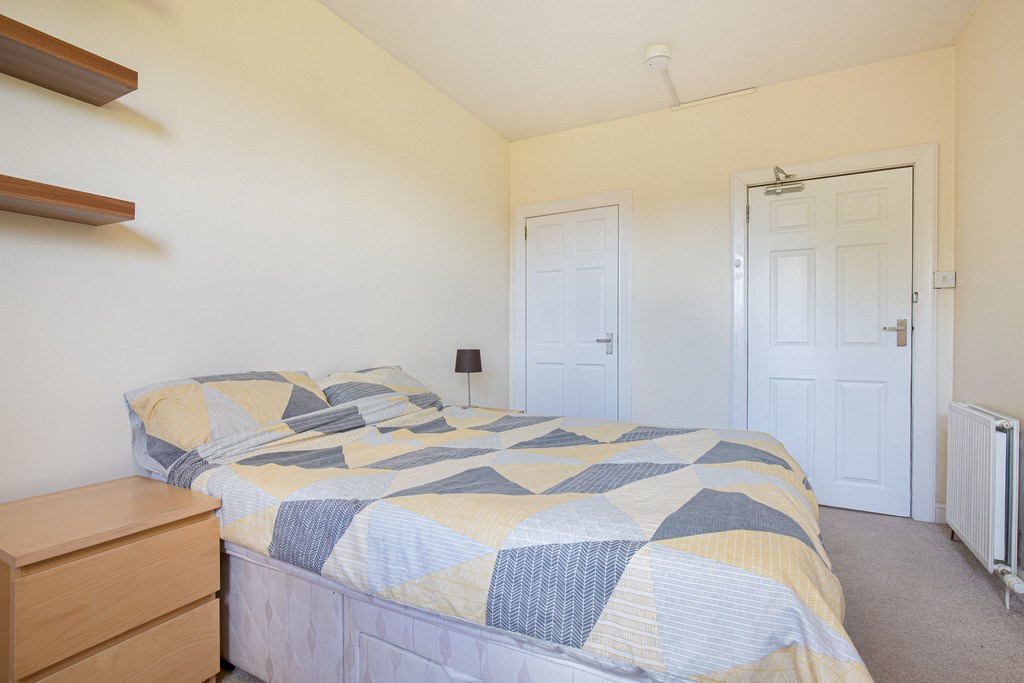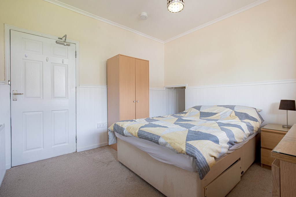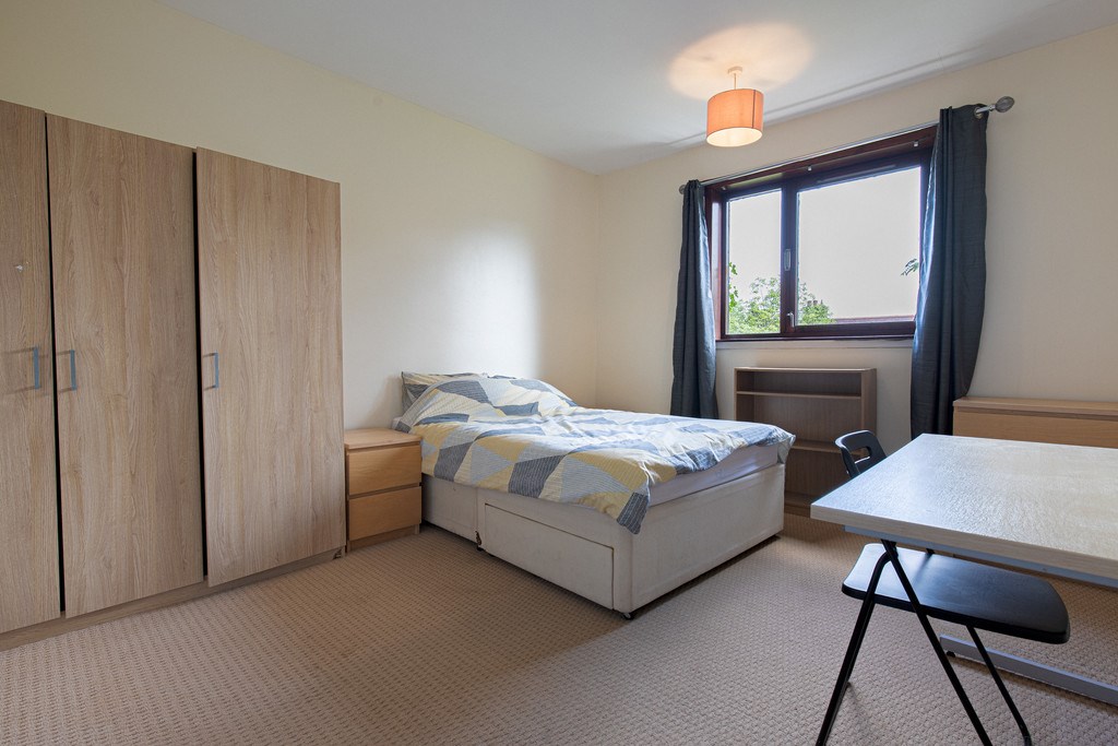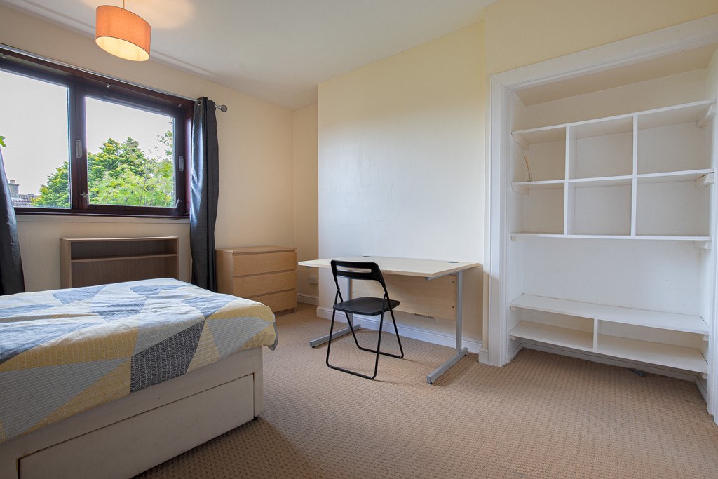 BEDROOM 3 The third bedroom is a bright and spacious double, complete with a comfortable bed, desk, and ample storage including a large wardrobe and additional shelving. A wide rear-facing window brings in plenty of natural light while offering pleasant views of the garden, making the room ideal for studying or working from home. Neutral décor and fitted carpet provide a versatile finish, ensuring the space feels both practical and welcoming for tenants.