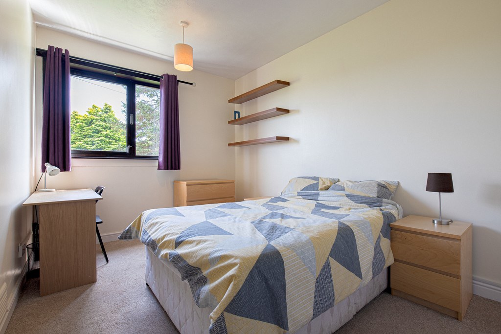 BEDROOM 2 The second double bedroom is generously proportioned and attractively presented, with neutral décor and fitted carpet for a clean, modern finish. A large rear-facing window provides plenty of natural light and overlooks the garden, creating a bright and pleasant atmosphere. The room is furnished with a double bed, bedside tables, chest of drawers, and a study desk, making it an ideal space for students or professionals alike. Wall-mounted shelving offers additional storage and display options, adding both practicality and character to the room.