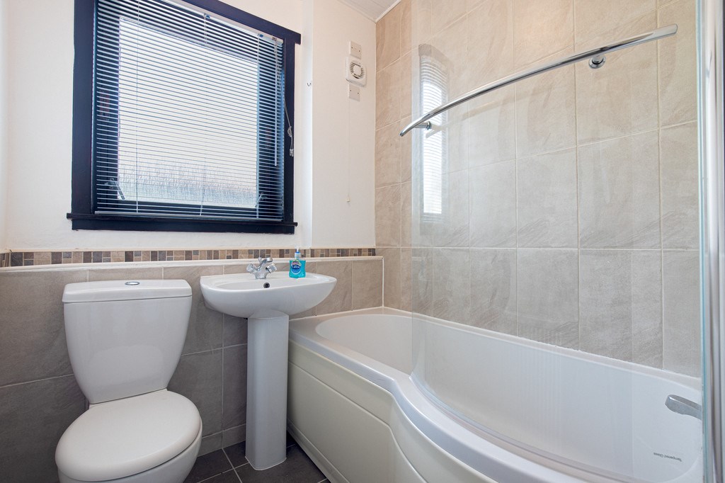 FAMILY BATHROOM The property benefits from a modern, fully tiled bathroom fitted with a white three-piece suite comprising WC, wash hand basin, and a P-shaped bath with overhead shower and glass screen. A large, frosted window allows natural light to flow in while maintaining privacy, and neutral wall tiles with mosaic border detailing give the space a fresh and contemporary finish.