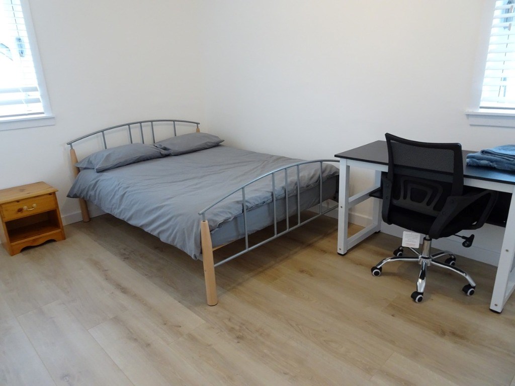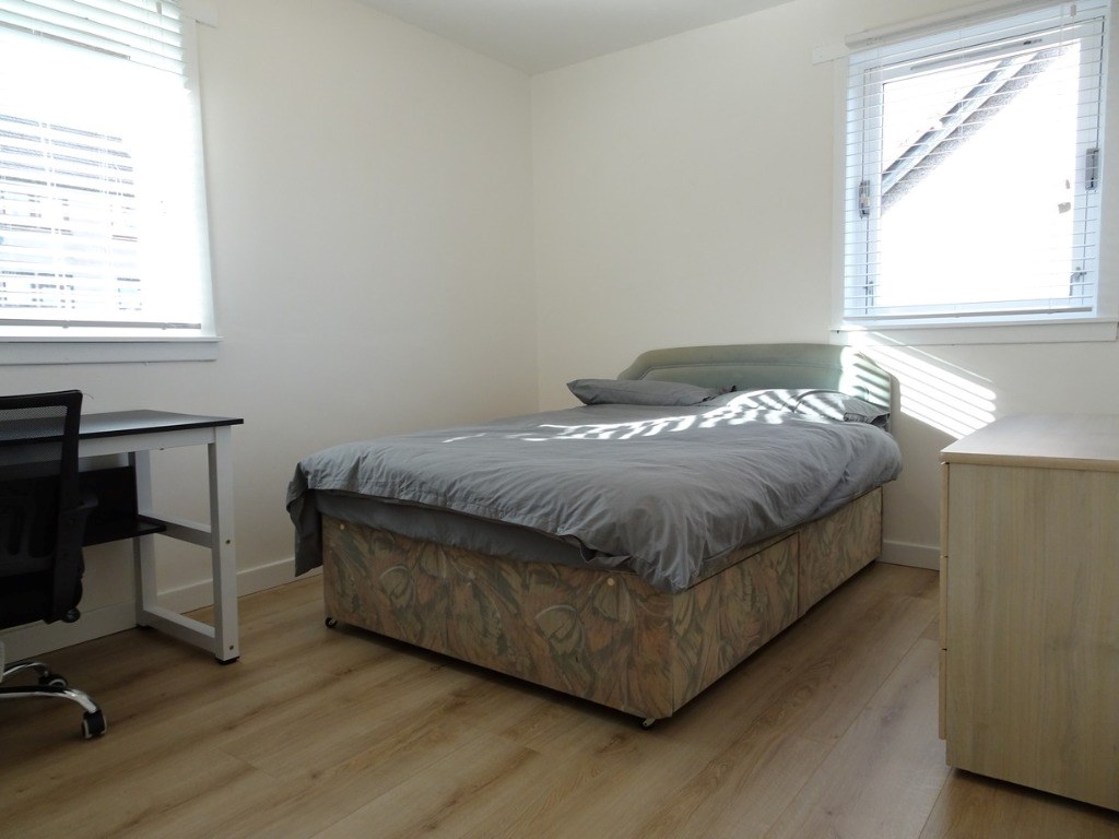 BEDROOM 2: Another good size double bedroom with dual aspect windows. Similarly fitted to bedroom 1 with double bed, chest of drawers, fitted wardrobe, modern desk and chair, and each window fitted with white slatted blinds.