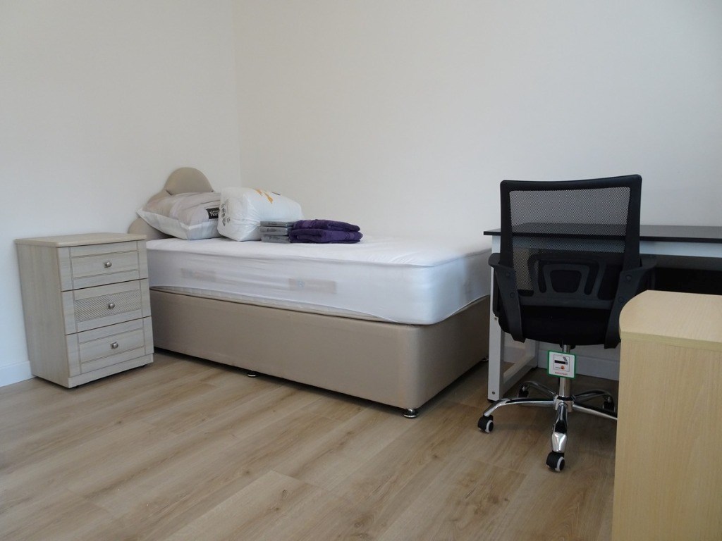 BEDROOM 3: Slighter smaller bedroom than the other two with a large single bed, bedside drawer unit, chest of drawers and fitted wardrobe. Two windows to the rear, both fitted with modern white slatted blinds.