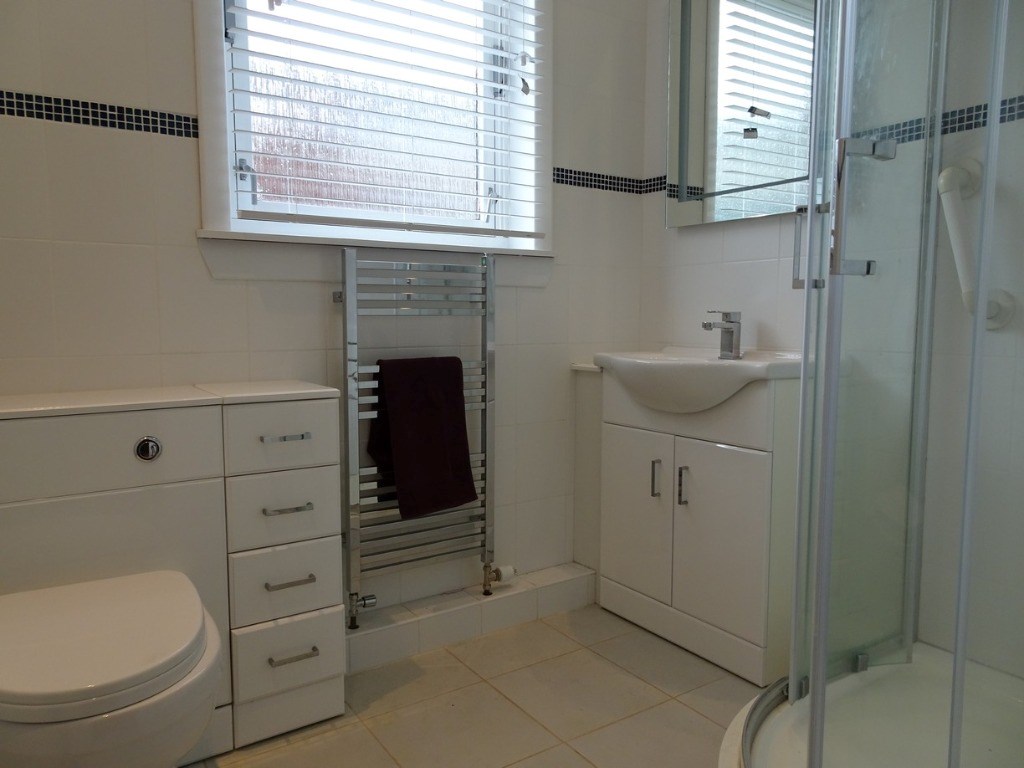 SHOWER ROOM: Accessed off the ground floor hall. Good size shower room with three piece white suite. Opaque window. Ladder radiator. Extractor fan. Tiled flooring.