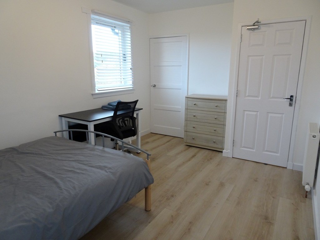 BEDROOM 1: Spacious room fitted with double bed, chest of drawers, two fitted wardrobes, modern desk and chair. Window fitted with white slatted blind.