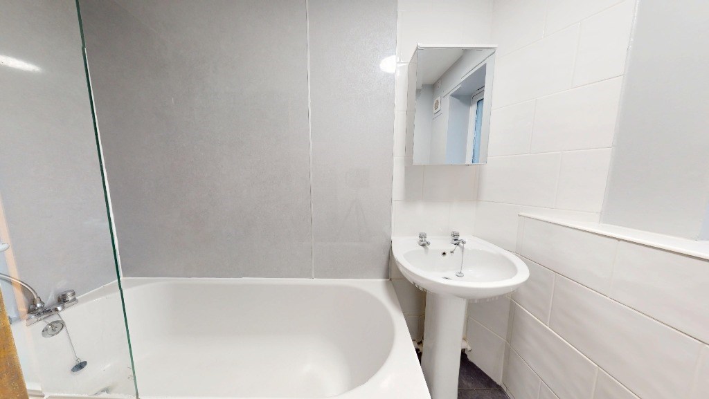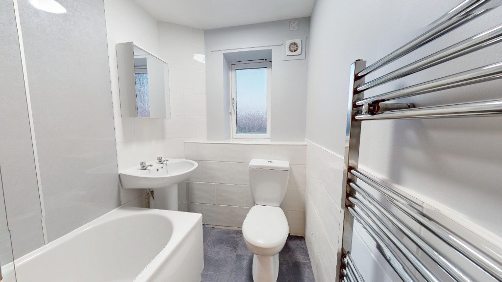 The bathroom is clean and bright, with white tiles, a pedestal sink, toilet, and a heated towel rail. A frosted window ensures privacy while still allowing light to enter. The bedrooms feature neutral décor, carpeted floors, and large windows offering views of the surrounding area. Built-in wardrobes provide valuable storage space.