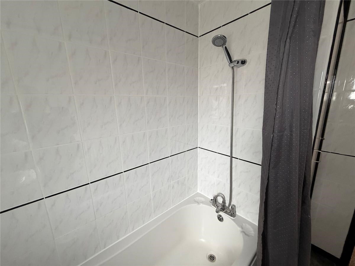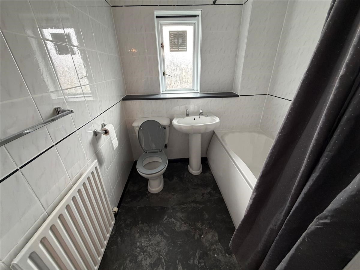 The property comprises a spacious living room with dining area, a fully fitted kitchen, and a fully tiled bathroom with white suite and electric shower.