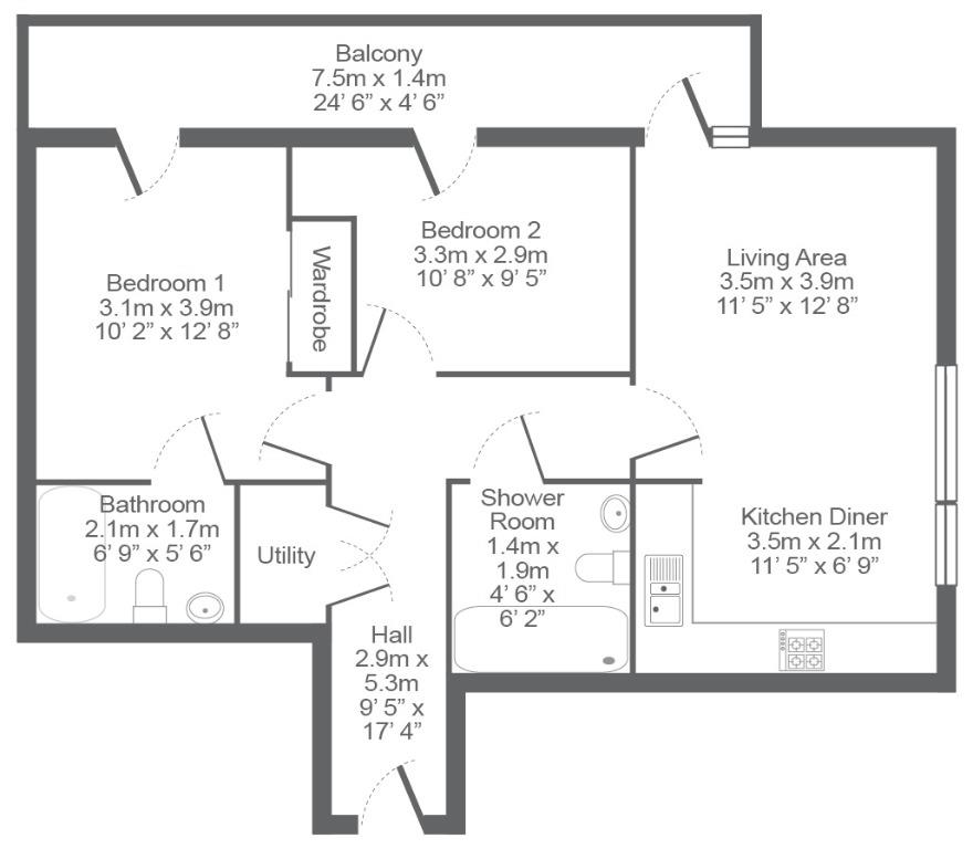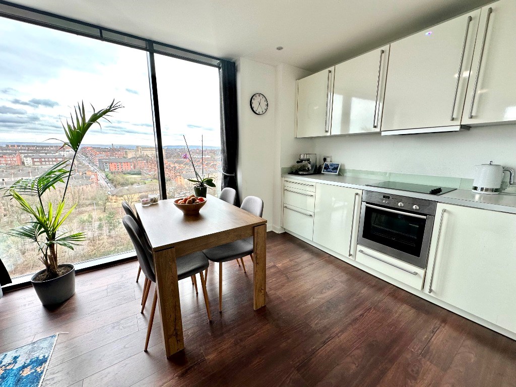 This modern high spec property is entered into via secure fob entry system into the well maintained communal entrance hallway which features two lifts and the private post boxes for all apartments. Internally the flat has a hallway with storage/utility cupboard which also houses the washing machine and leads to all rooms. There is a spacious open plan lounge / dining area / kitchen featuring a modern fitted kitchen with integrated appliances including under counter fridge, under counter freezer, dishwasher, ceramic hob and electric oven. This room has stunning views over the Glasgow and the River Clyde and also gives access out onto the large private balcony which is perfectly situated for watching the sun set over Glasgow. There are two double bedrooms, the main bedroom with fitted wardrobes as well as a modern en-suite bathroom and both bedrooms also give access out onto the private balcony. Completing the accommodation is an internal main shower room with modern white ceramics and walk-in shower with mains powered shower.