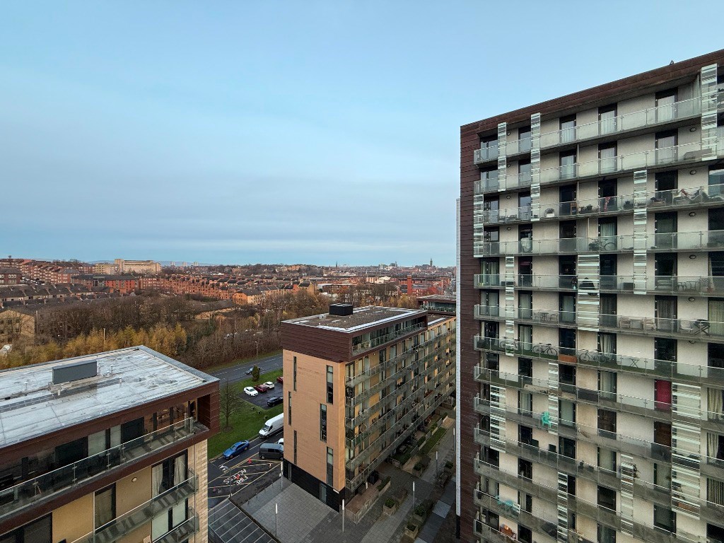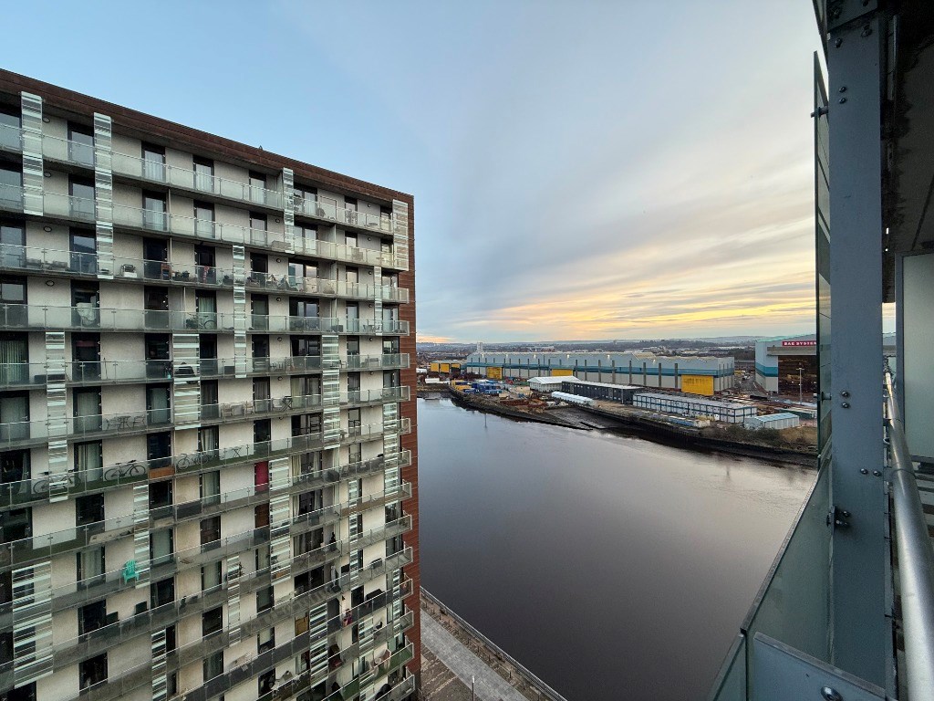 The apartment consists of open plan lounge/kitchen with integrated appliances and easy to maintain laminate flooring, a double bedroom with mirrored robes and bathroom with heated towel rail, concealed storage and shower over bath. The living room has floor to ceiling windows with views onto the Courtyard and the River Clyde and there is a balcony which runs along both the lounge and the bedroom. The development benefits from 12 hour concierge and the property is ideally located for easy access to the Clydeside Expressway and Clyde Tunnel.