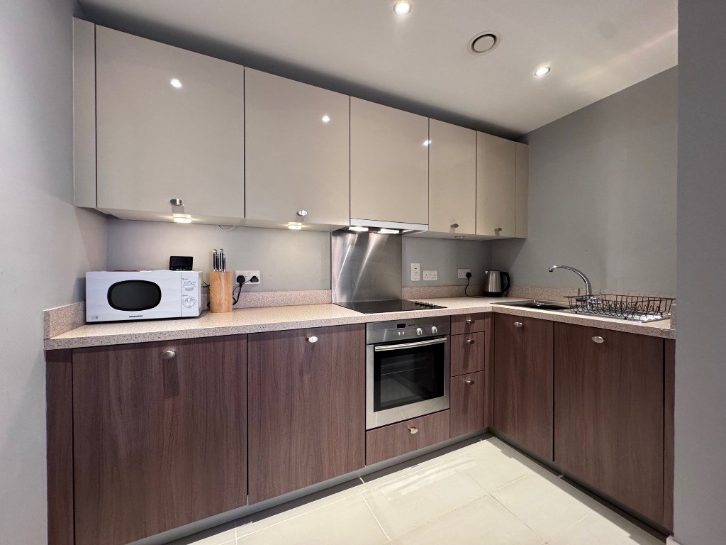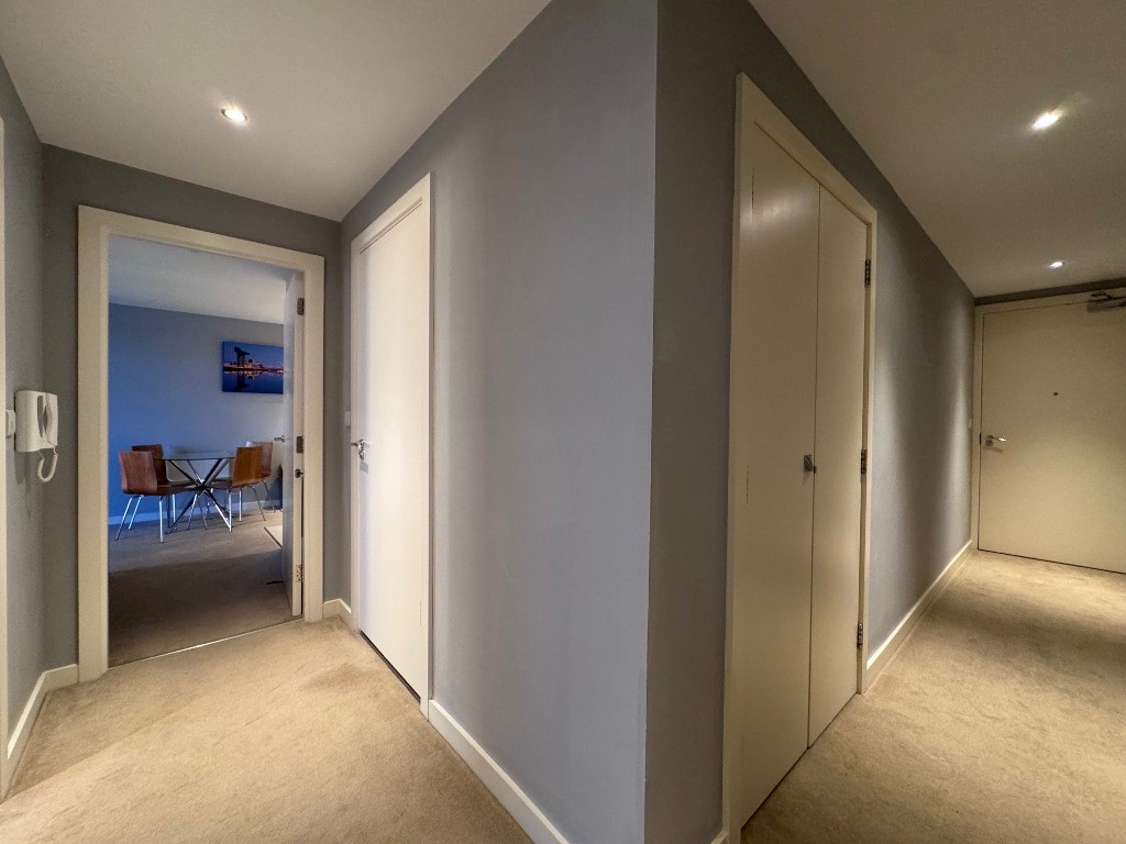 Positioned on the 5th floor, this generous property opens into a substantial L?shaped hallway that provides an immediate sense of space. The flat features a bright and well?proportioned double bedroom complete with fitted wardrobes and direct access to a private balcony, creating an ideal spot for morning coffee or evening relaxation. The internal bathroom is finished in neutral tones and includes a shower over bath. The open?plan living area combines a comfortable lounge with a sleek, fully fitted contemporary kitchen, making it perfect for both everyday living and entertaining.
