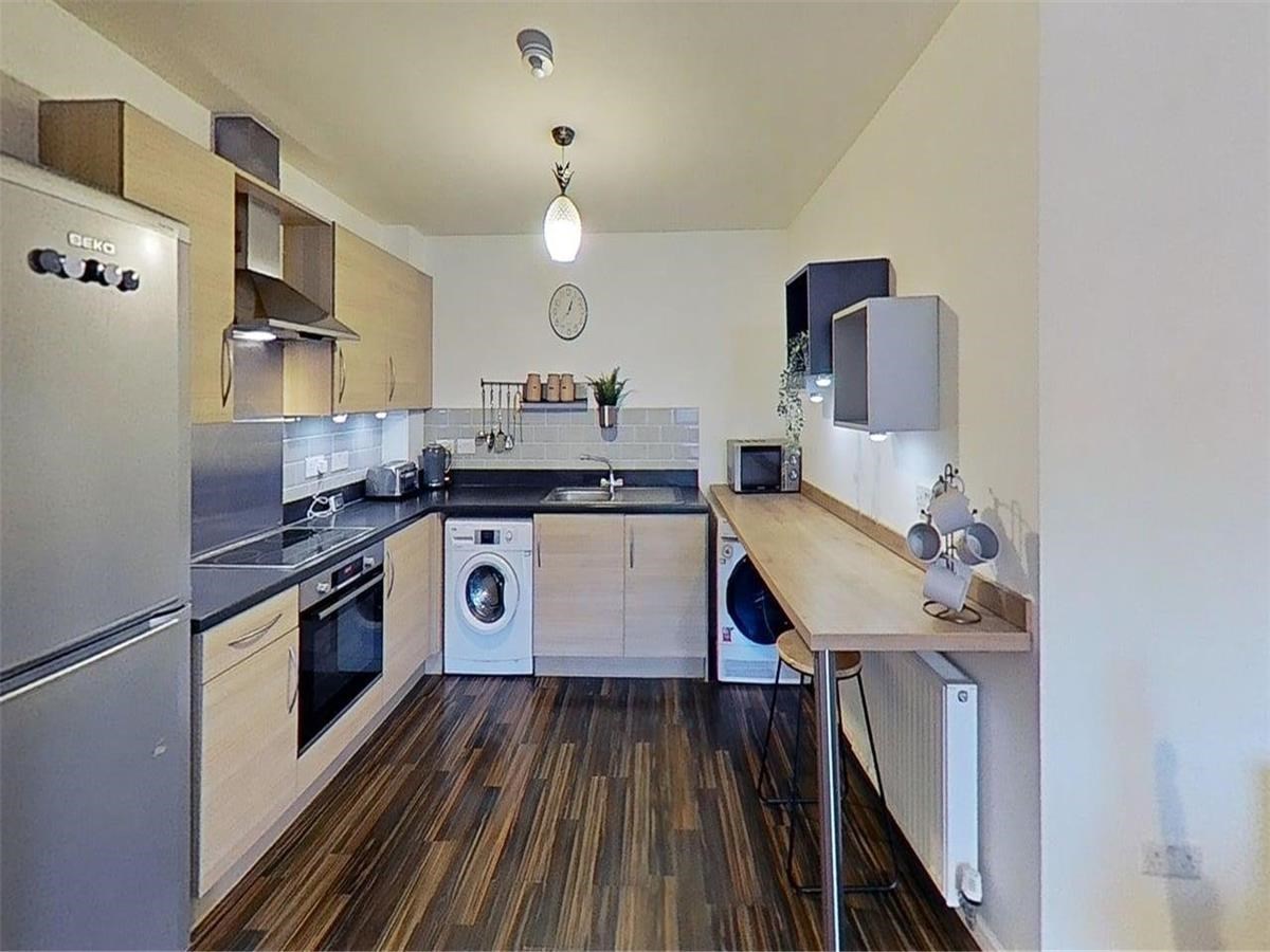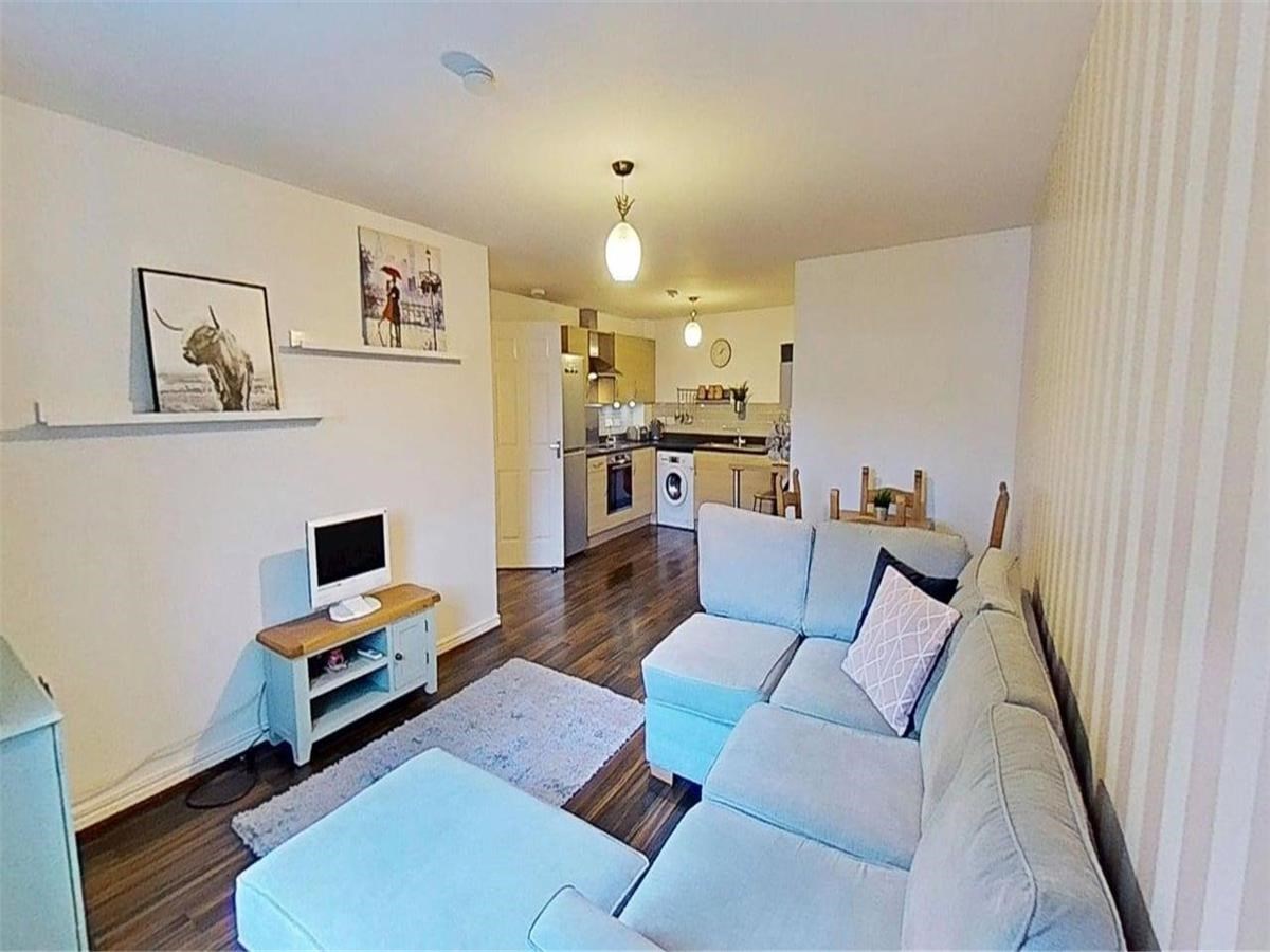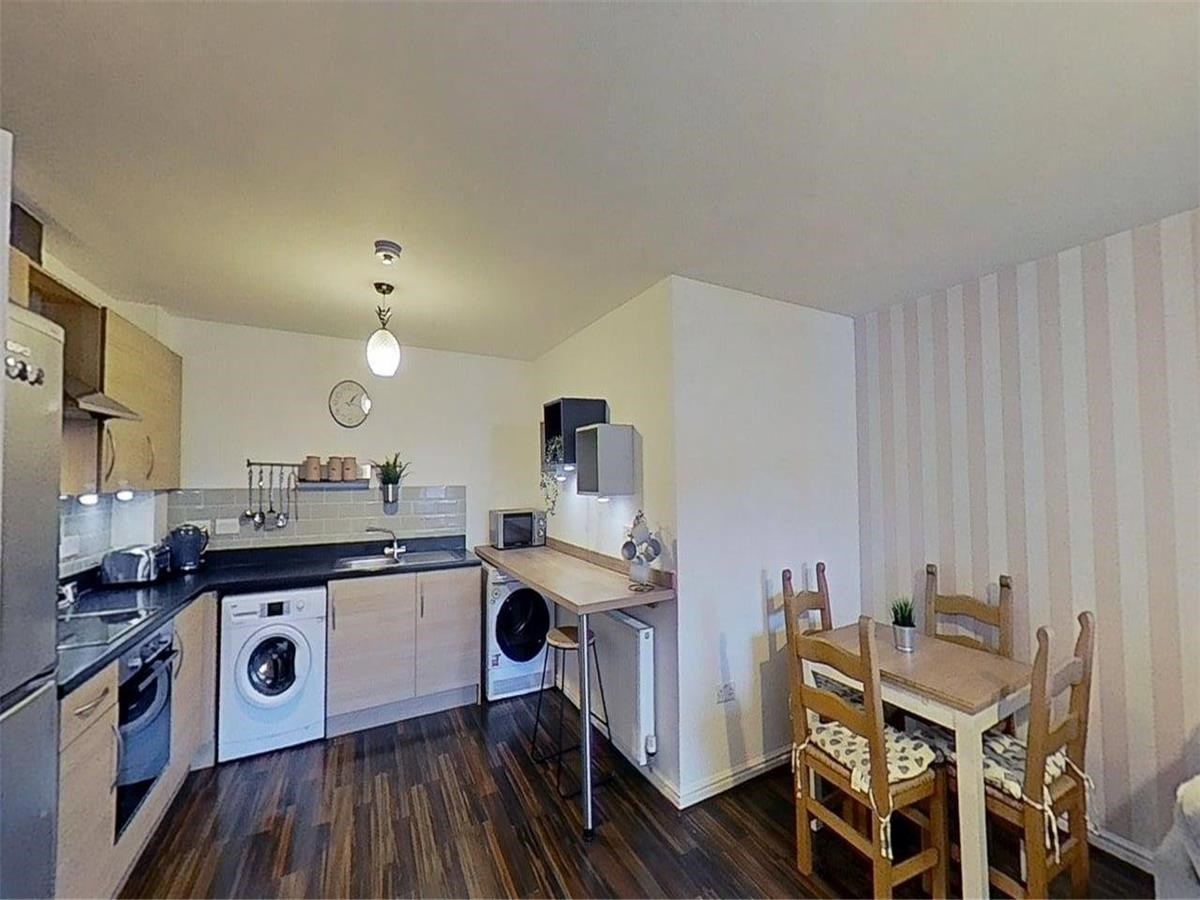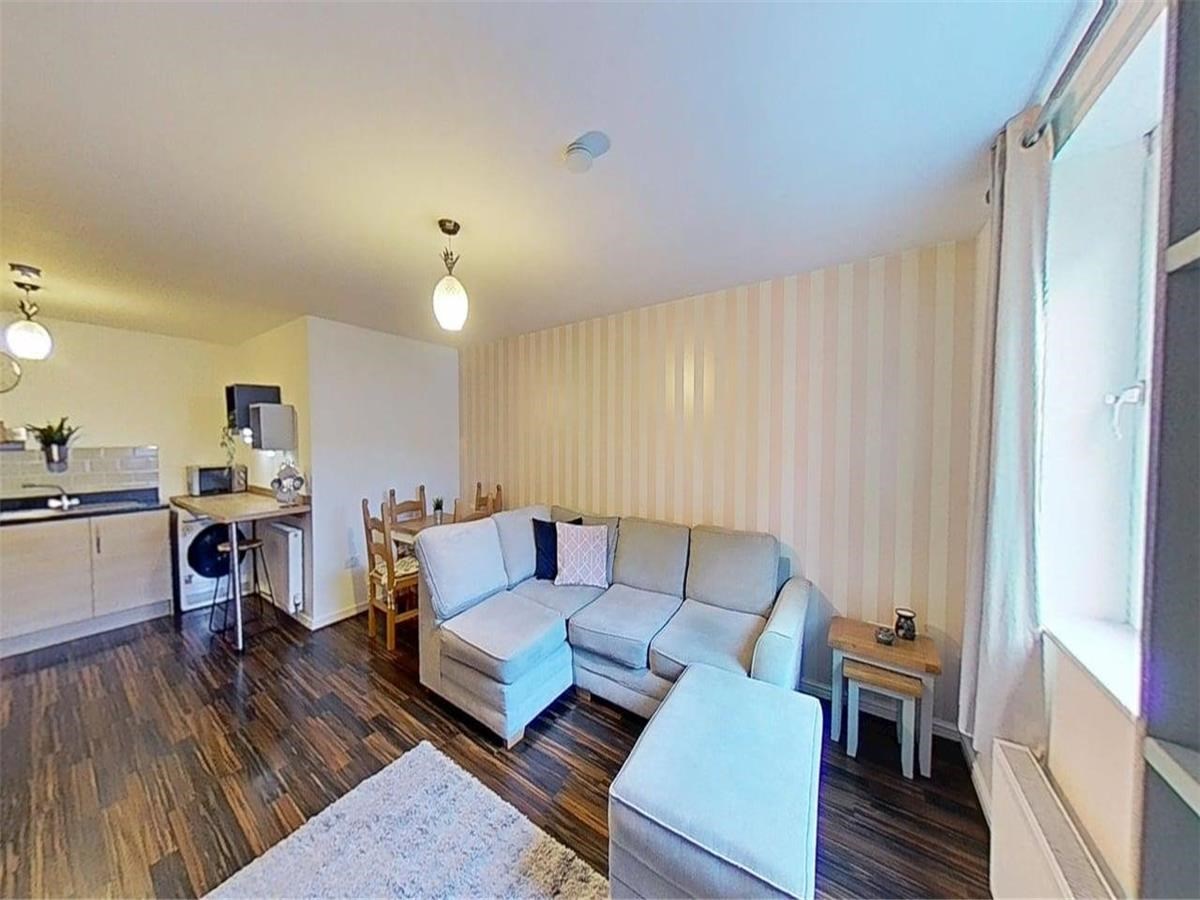 The spacious open-plan living, dining and kitchen area offers an excellent space for modern living and entertaining. The principal double bedroom benefits from built-in wardrobes en-suite shower room and private balcony. There is a further double bedroom and a modern family bathroom fitted with a white suite and shower over the bath, completing the accommodation.