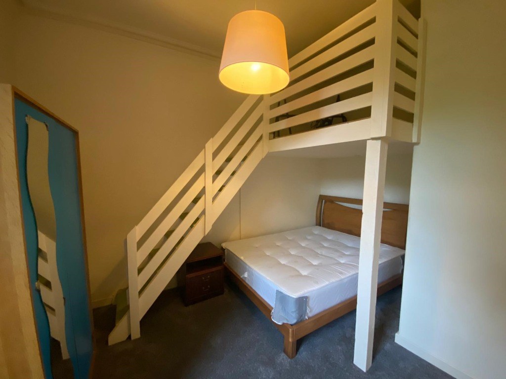 The accommodation comprises a bright lounge with modern furnishings, a well-equipped kitchen with all essential appliances including a washing machine, a spacious double bedroom with a unique mezzanine level providing additional storage or a cosy study space, and a contemporary shower room.