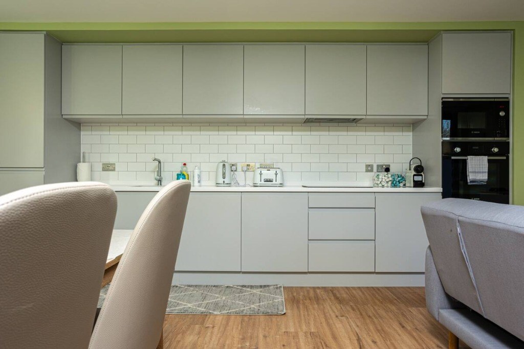Towards the back of the property is the impressive open plan kitchen/living area which is incredibly modern and chic, with integrated appliances including a large fridge freezer, electric hob, oven, microwave and dishwasher.