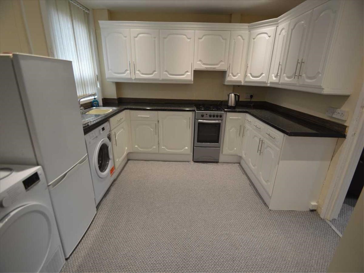 How about a great size kitchen with white wood units, contrasting dark grey work tops, appliances included, storage cupboard and plenty of space for dining?