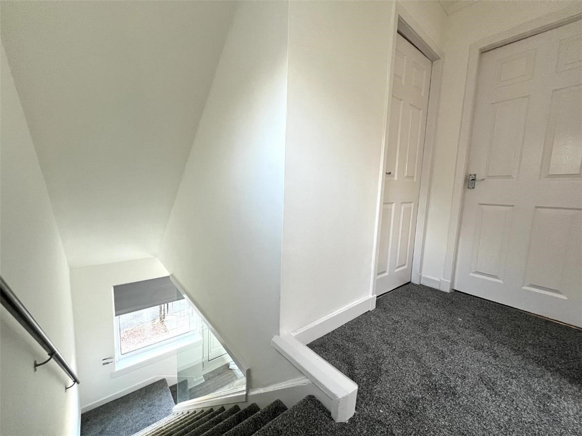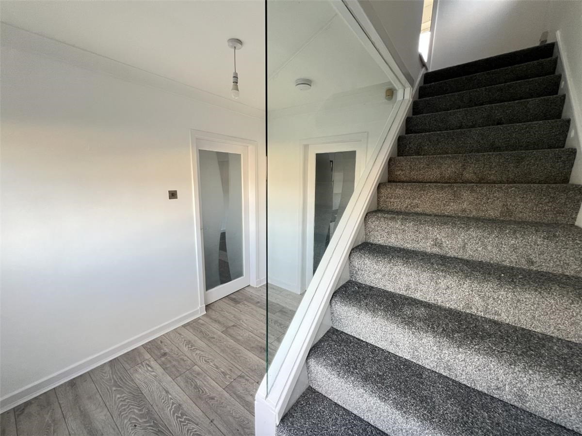 Upstairs comprises two well-proportioned bedrooms and a family bathroom. Both bedrooms feature new grey carpets and neutral décor, with one benefiting from a built-in double wardrobe offering excellent storage. The bathroom is fitted with a three-piece white suite and an over-bath electric shower.